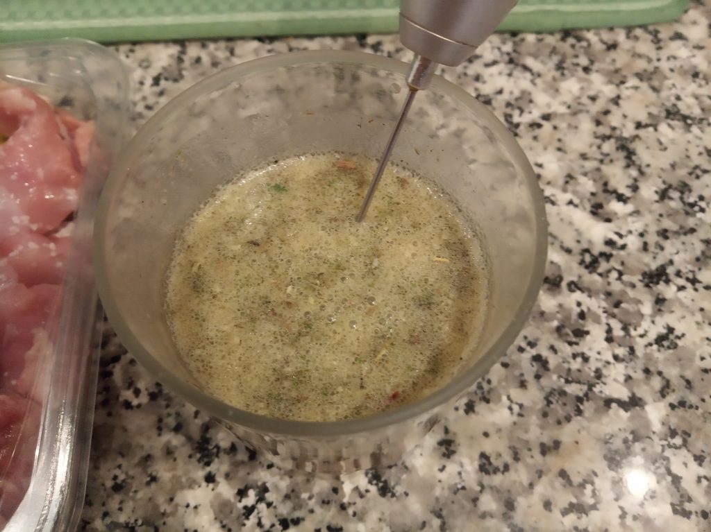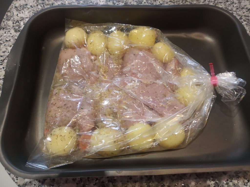 En otro ½ vaso de agua, echamos el aceite y el sobre de sazonador de Ajo y Limón, mezclar bien y echar por encima del pollo y las papas.