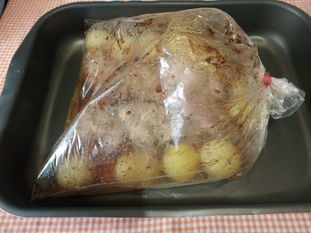 Colocar la bandeja encima de la bandeja de horno, e introducir en el horno en la parte de abajo, para que al hincharse la bolsa no dé en la rejilla de arriba.