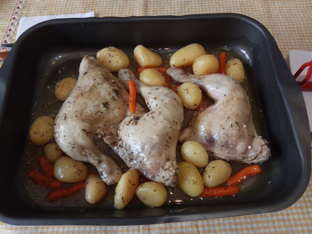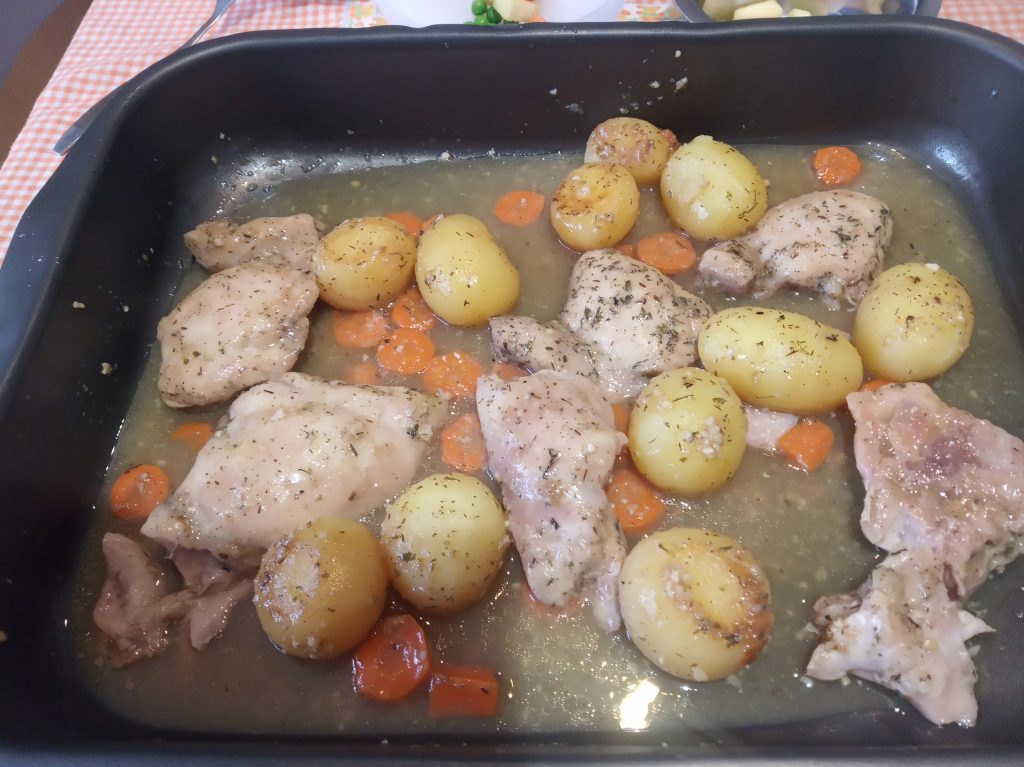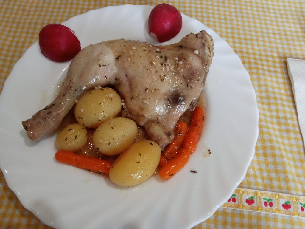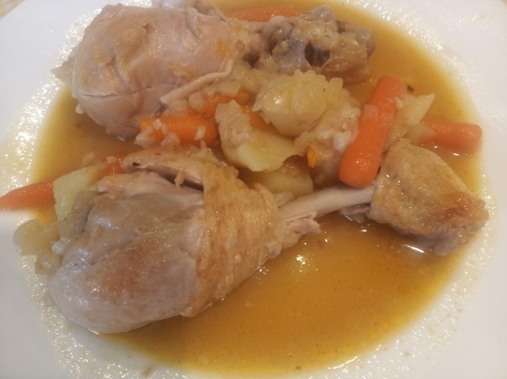 Servir en plato llano, 2 piezas de pollo, zanahorias y patatas, con su salsita y pan para quien quiera mojar.