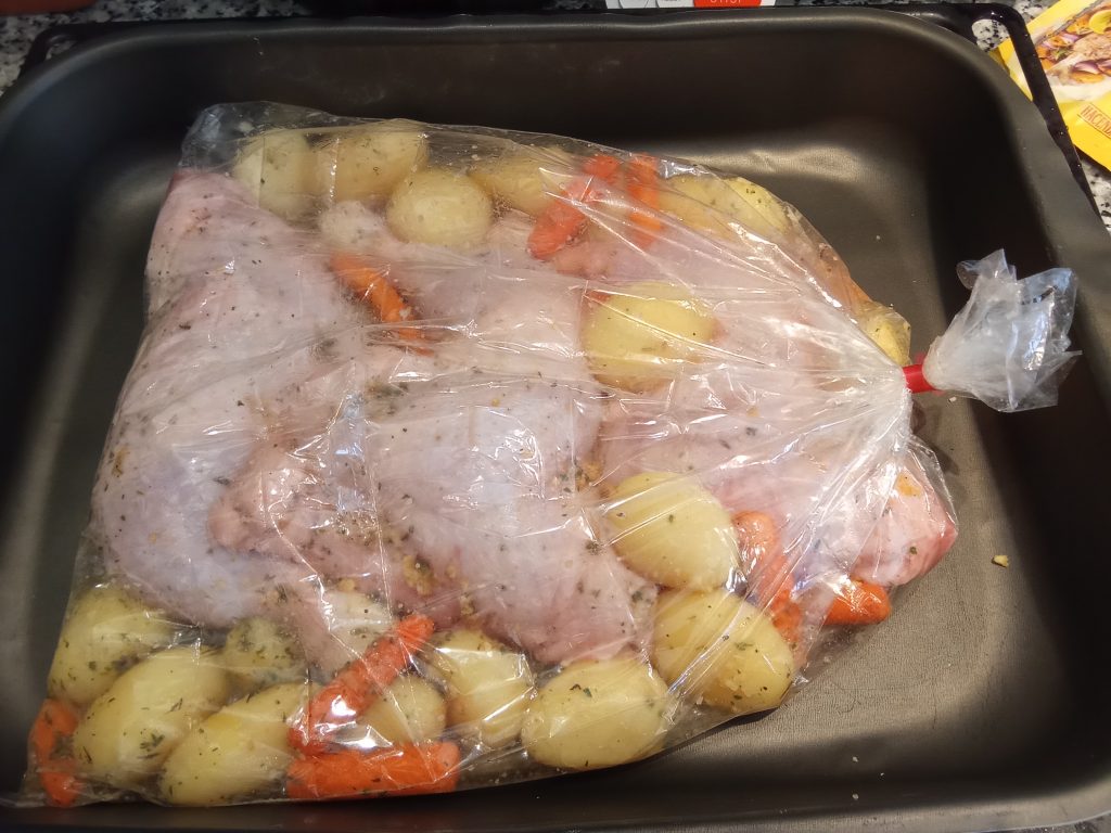 En una bandeja grande apta para horno, colocamos la bolsa, le echamos en el fondo las zanahorias.