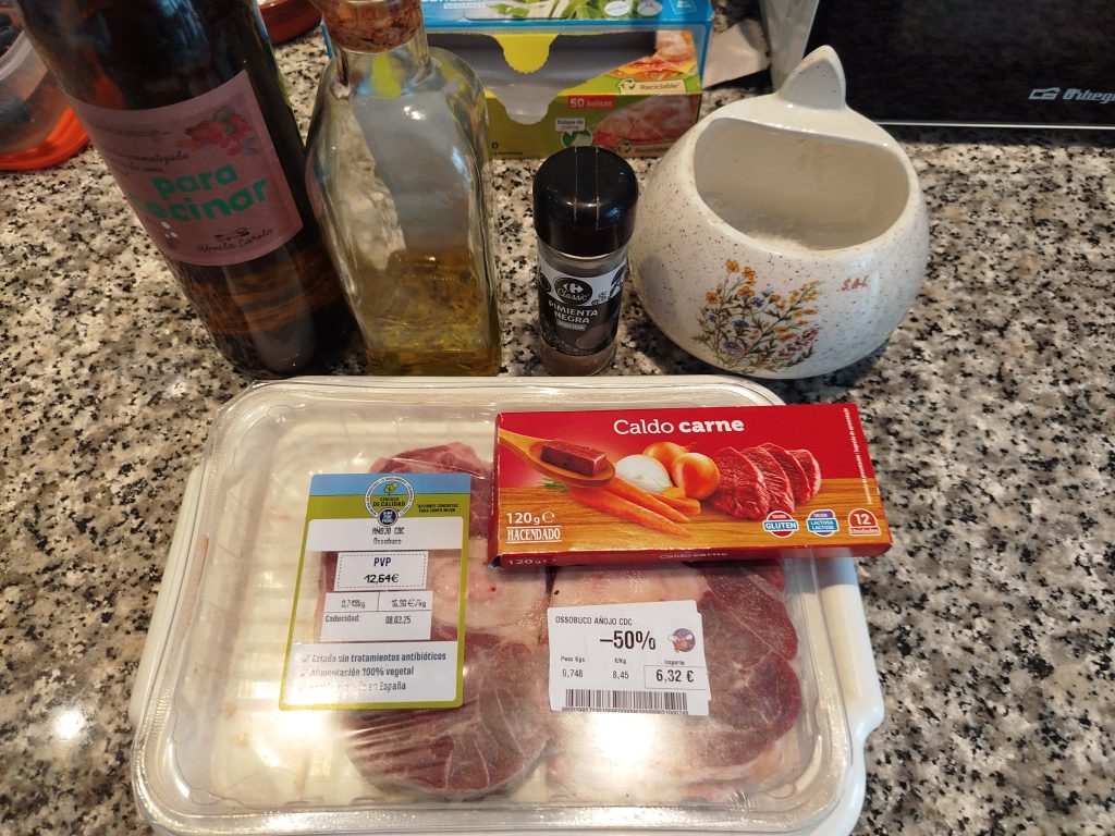 Compre 2 ossobuco al 50% y lo congele, porque suelen ser de próxima caducidad. Así que hay que acordarse de descongelar el día anterior en el frigorífico.