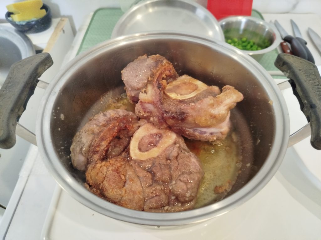 Lo primero que hay que hacer, es echarle sal y pimienta, y pasarlo por la harina, echar un fondo de aceite en una olla grande, y dorar los ossobuco, por los dos sitios, y reservar.