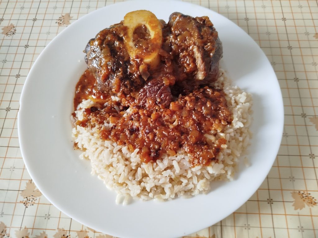 Emplatar en plato llano, el ossobuco, con el arroz integral, y la salsa.