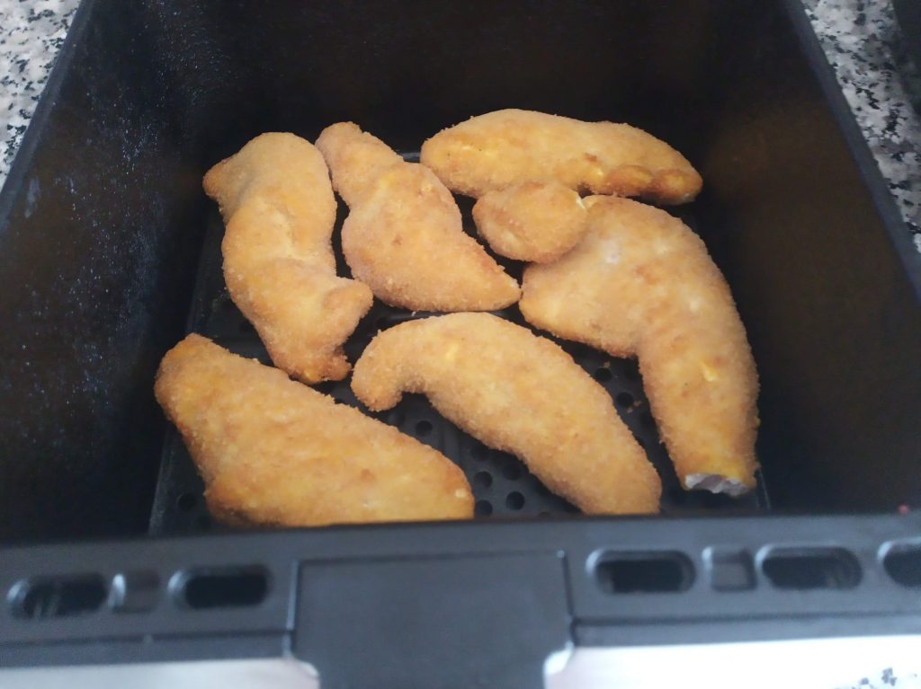 Colocar en el cestillo 6 palitos de pollo, congelado.