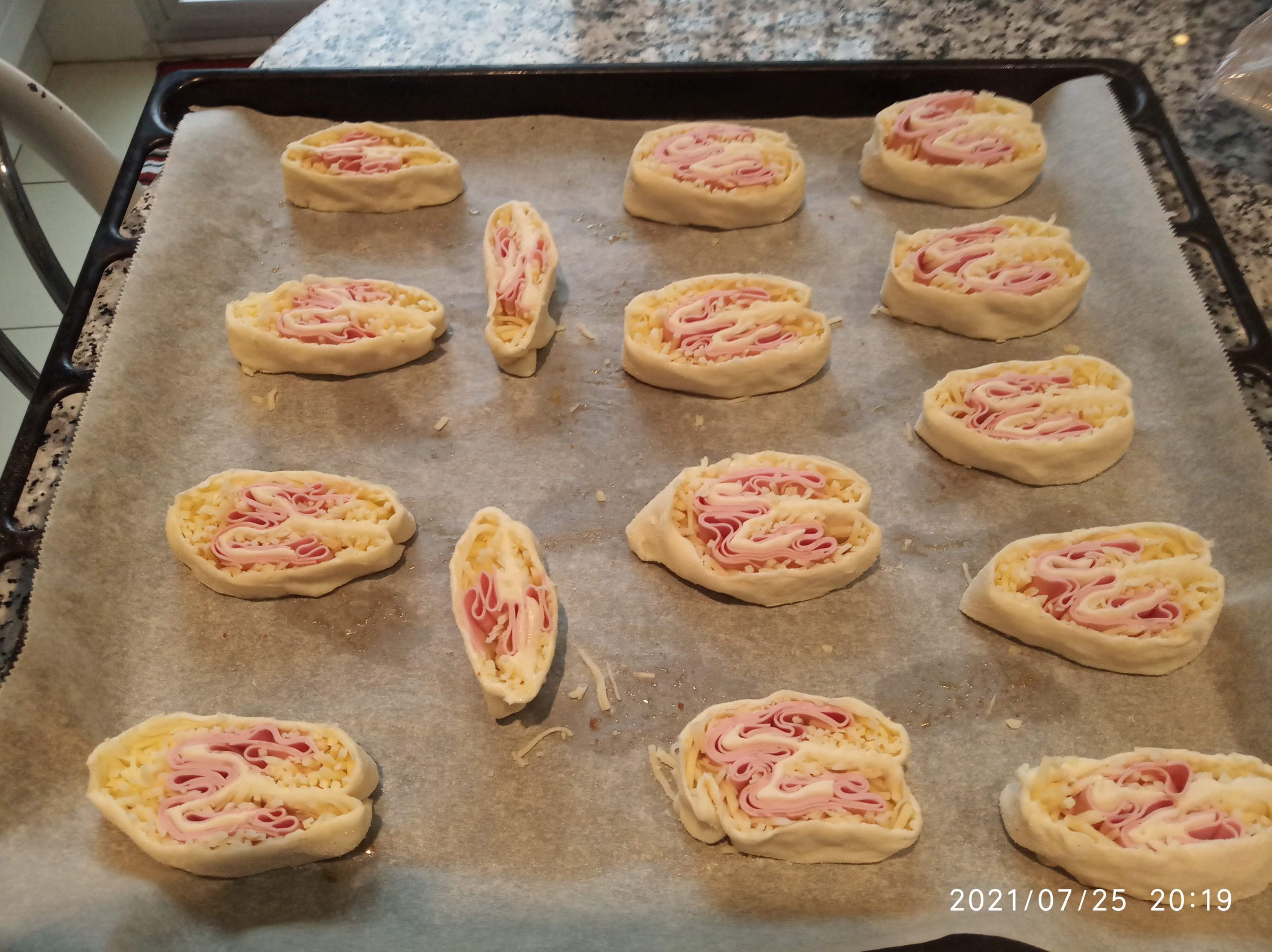 Cortar en trozos de un dedo de grosor y colocar hacia arriba en la fuente forrada con papel de horno. Dejar espacio entre ellas, para que, al hornearse, se habrán como palmeritas.