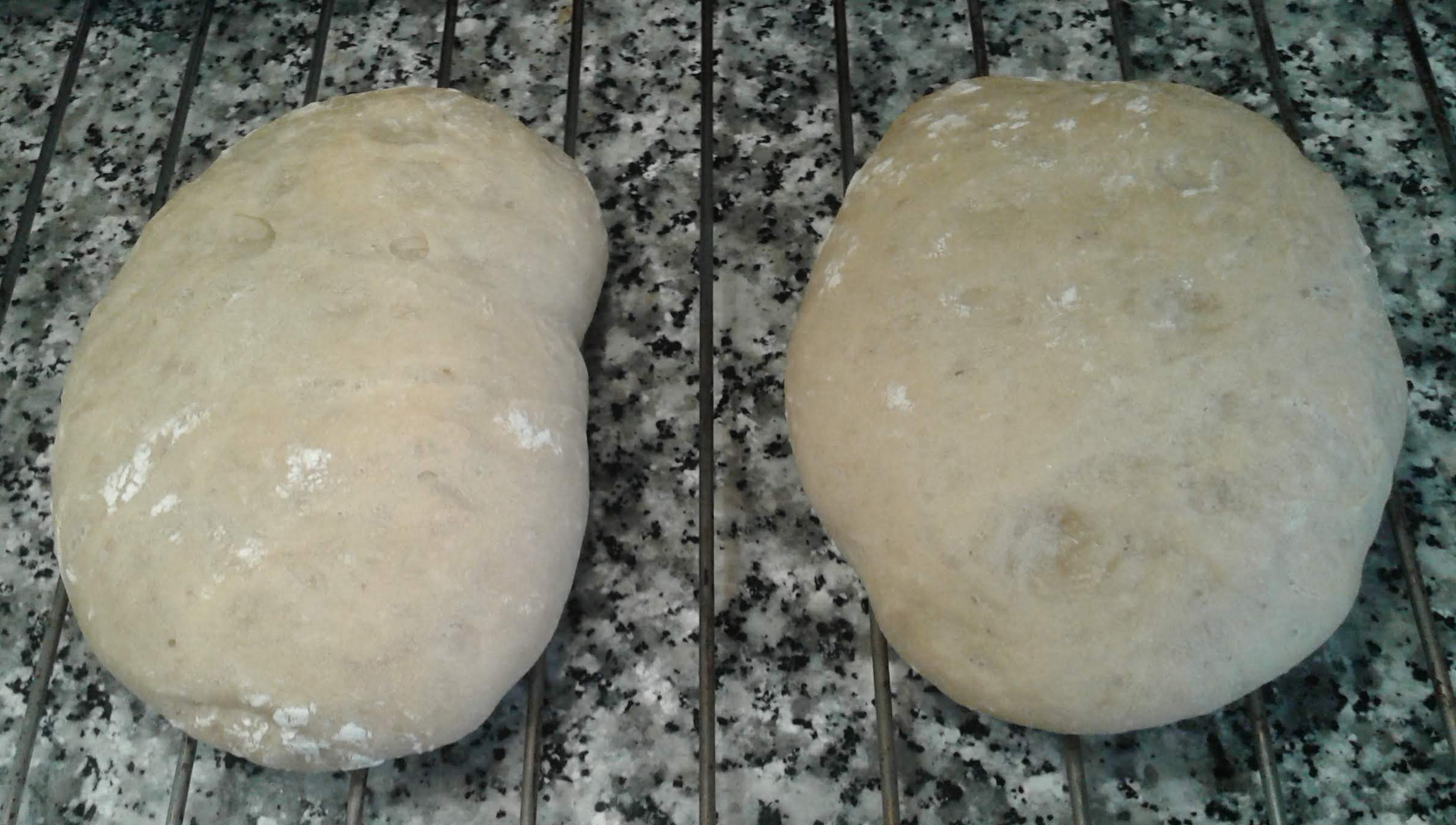 Echar otra vez harina en la encimera, y sacar la masa y volver a amasar otra vez de fuera hacia dentro y dividir en 2 o 4 partes, dejar reposar en la bandeja de horno sobre papel de horno, tapada hasta que doble el volumen, una 1 hora más o menos