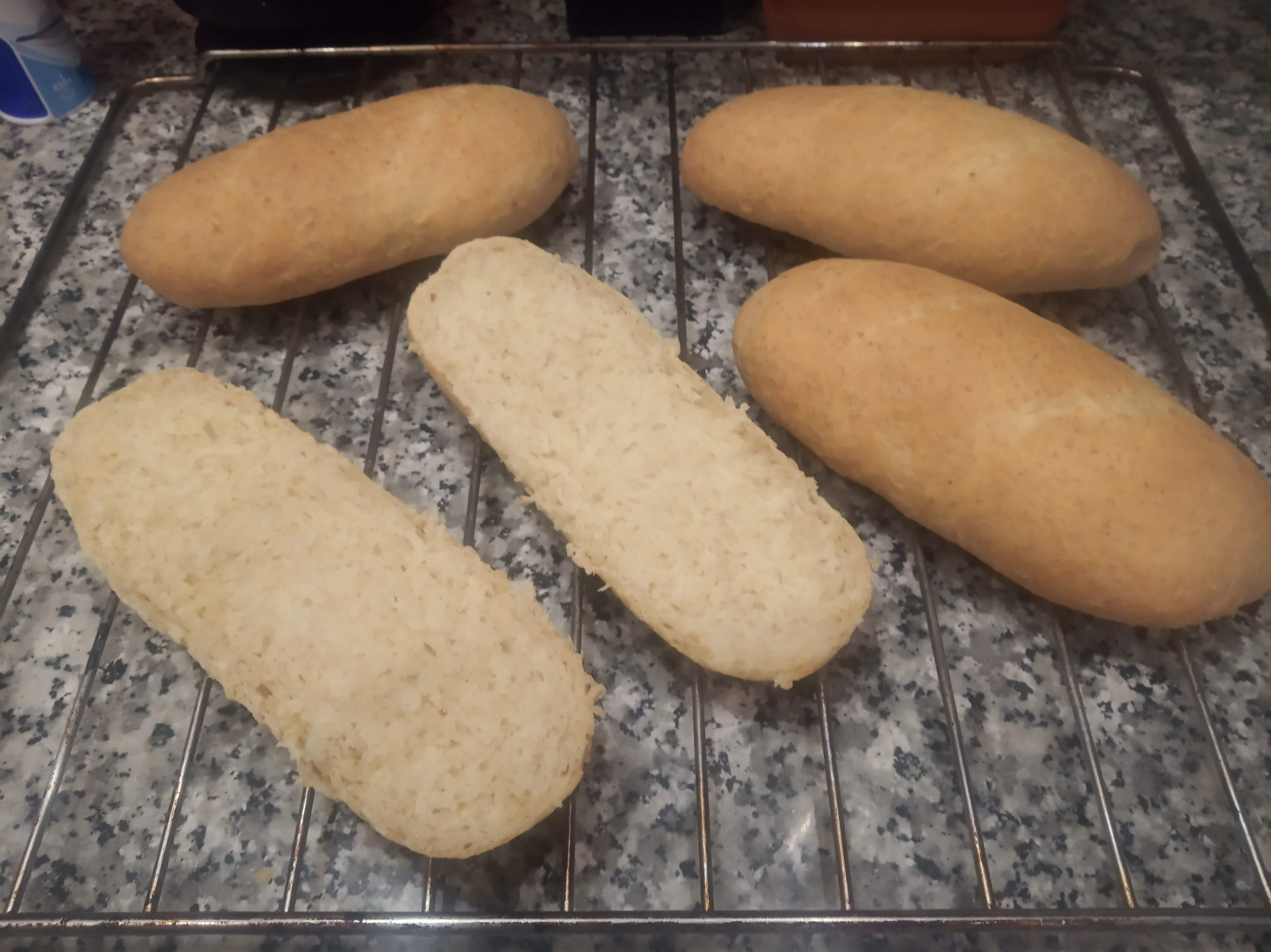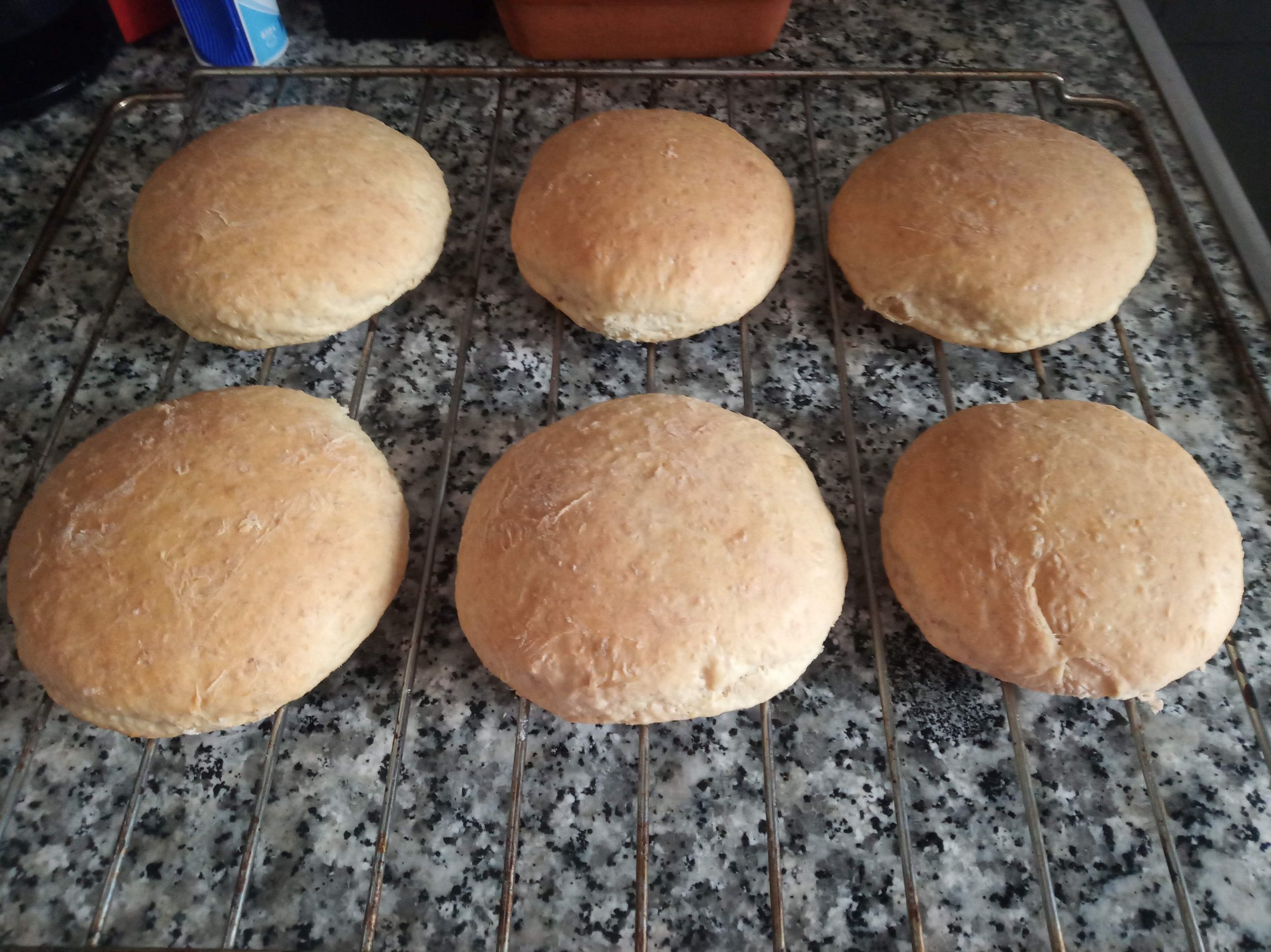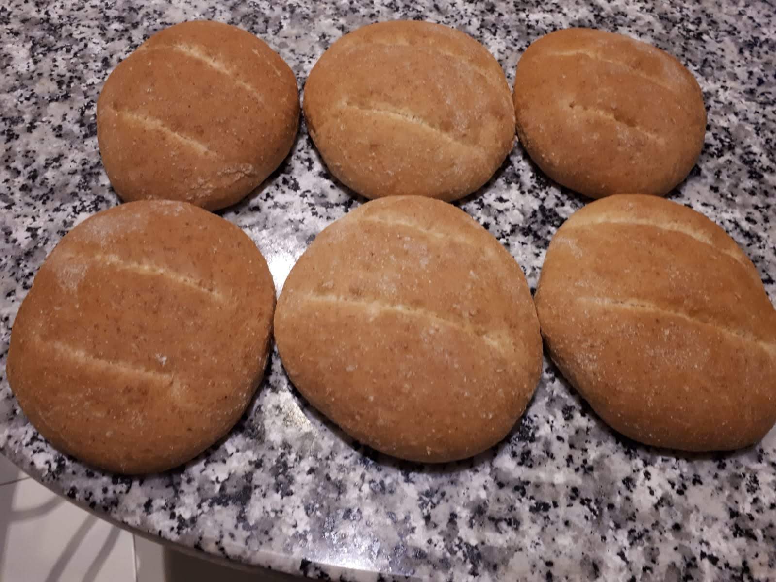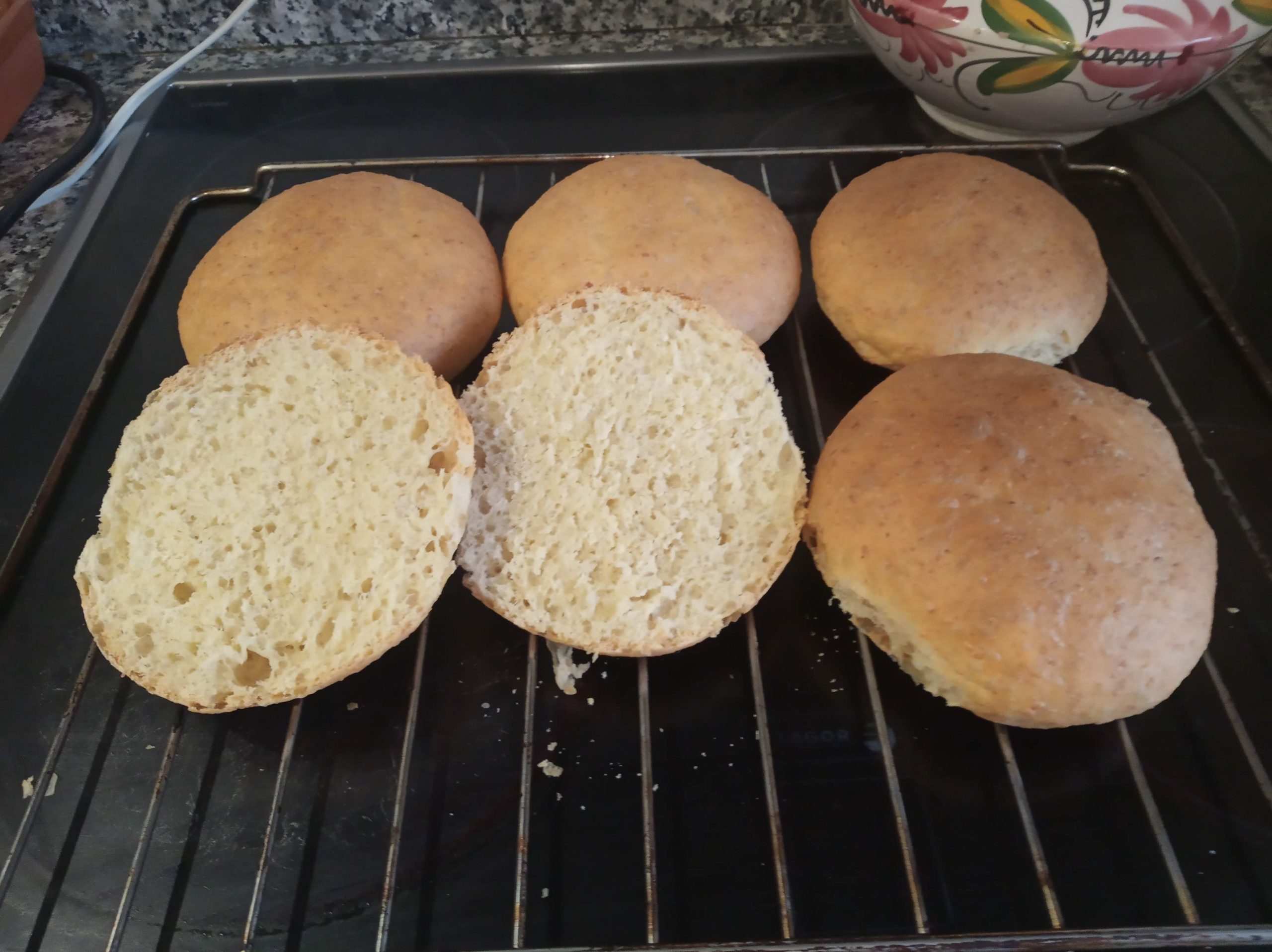 Como era para mi hijo que está a dieta y toma pan con salvado de avena, hice 4 panes, pero yo con la mitad tengo bastante, ya que llena mucho. Lo mejor hacer 6 panes de menos de 100 g cada uno.