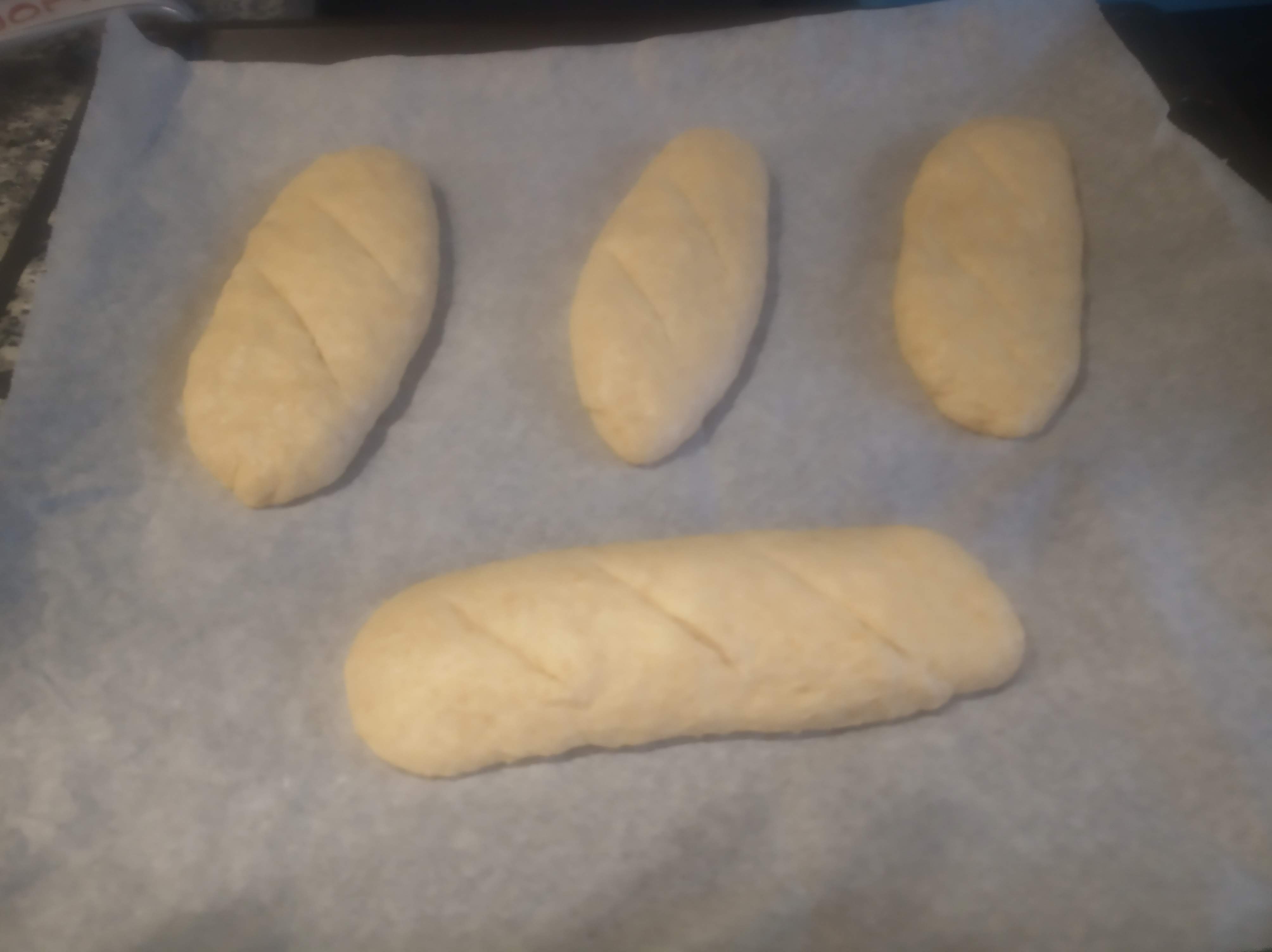 En la bandeja de horno, poner papel de horno y hacer 4 ó 6 panes con la masa, redondo o alargado y del tamaño que te guste, y meter en el horno sin calentar, durante 20 minutos,