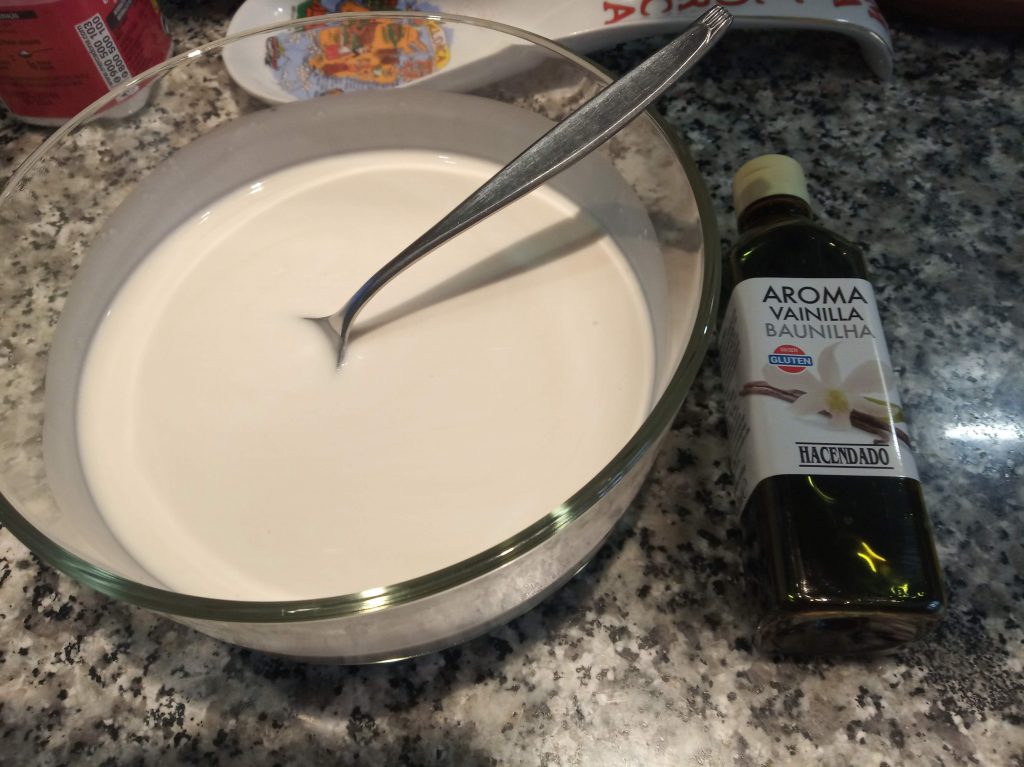 Añadimos el azúcar o edulcorante elegido, la esencia de vainilla y mezclar.