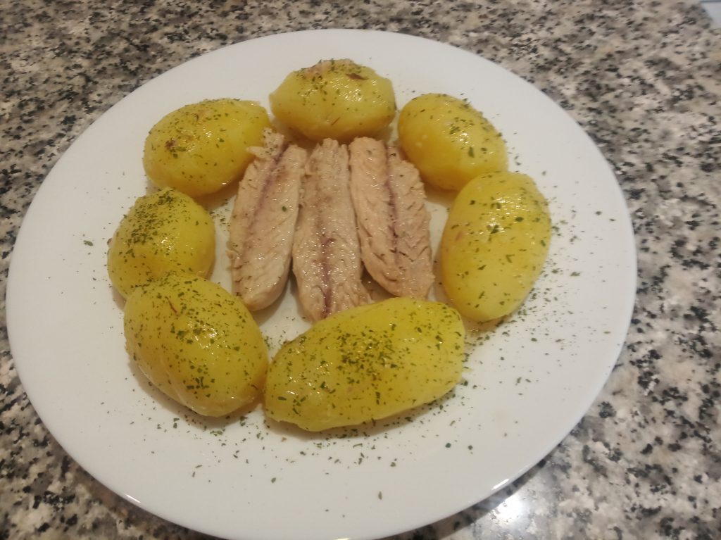 Luego repartir cada uno en su plato, cortar las patatas y si quiere le puede echar un poco de sal fina (optativo) y los filetes de melva.