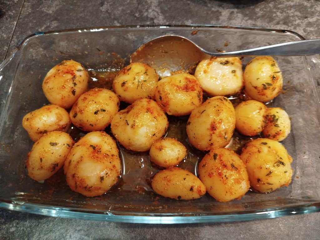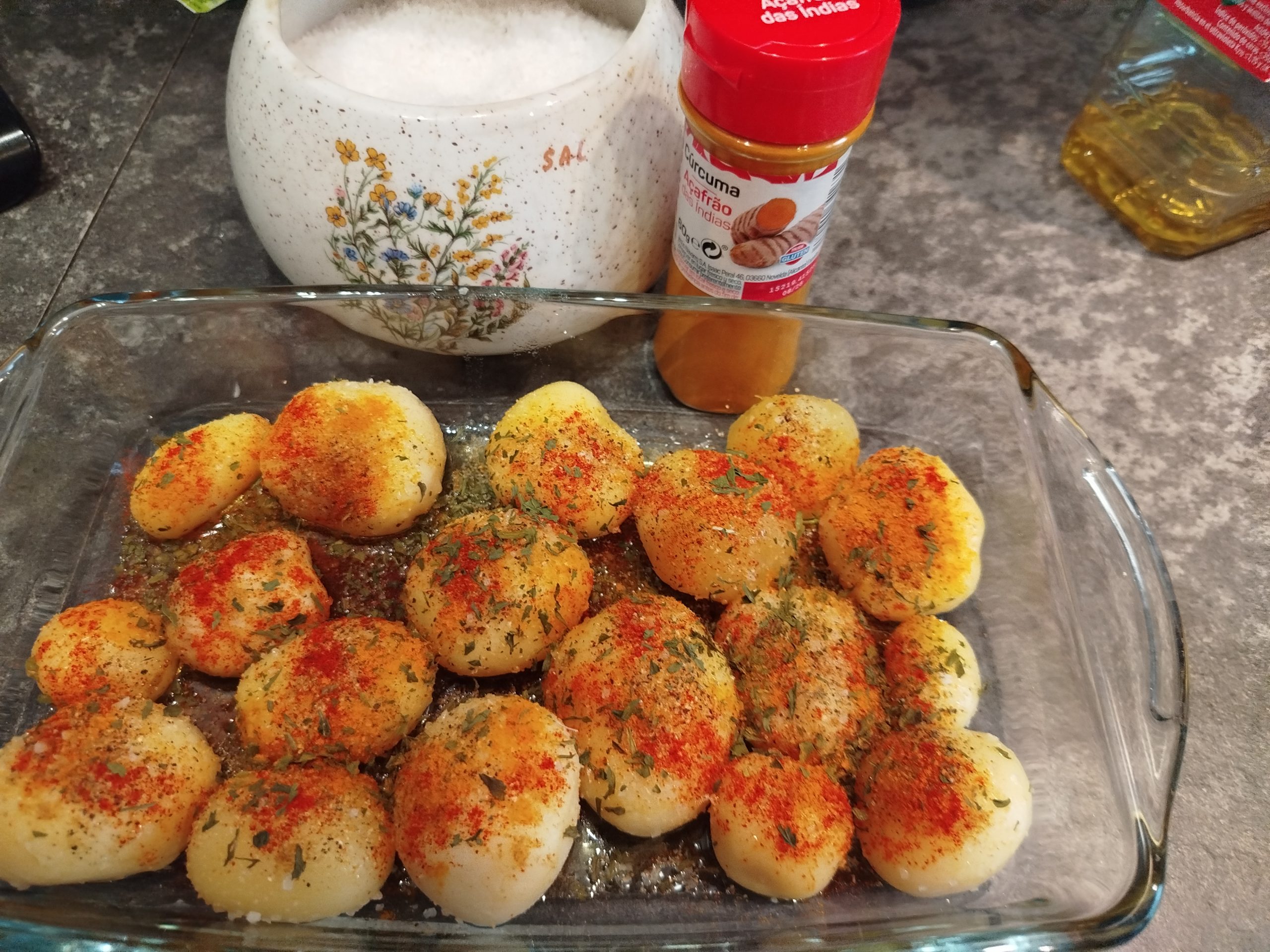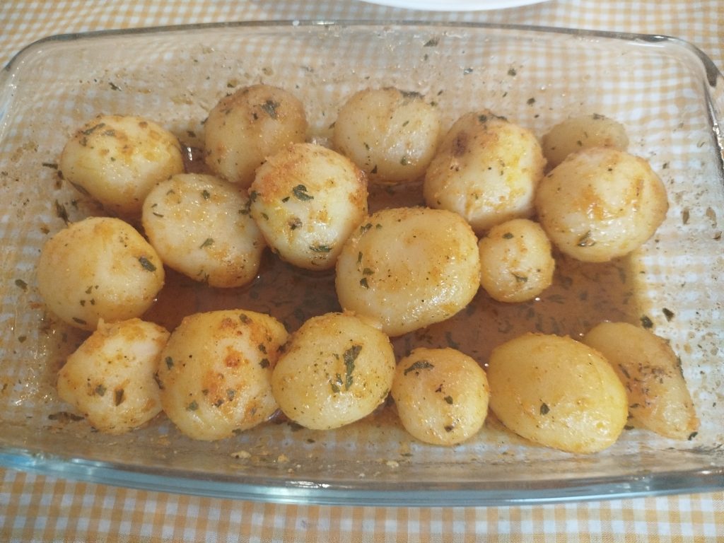 En una bandeja apta para Microondas y que quepa, echar las papas cocidas, y todos los ingrediente para el Marinado, mezclar las papas muy bien, y dejar reposar durante unas 2 horas, si no puedes tanto tiempo, no pasa nada.