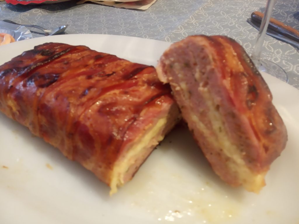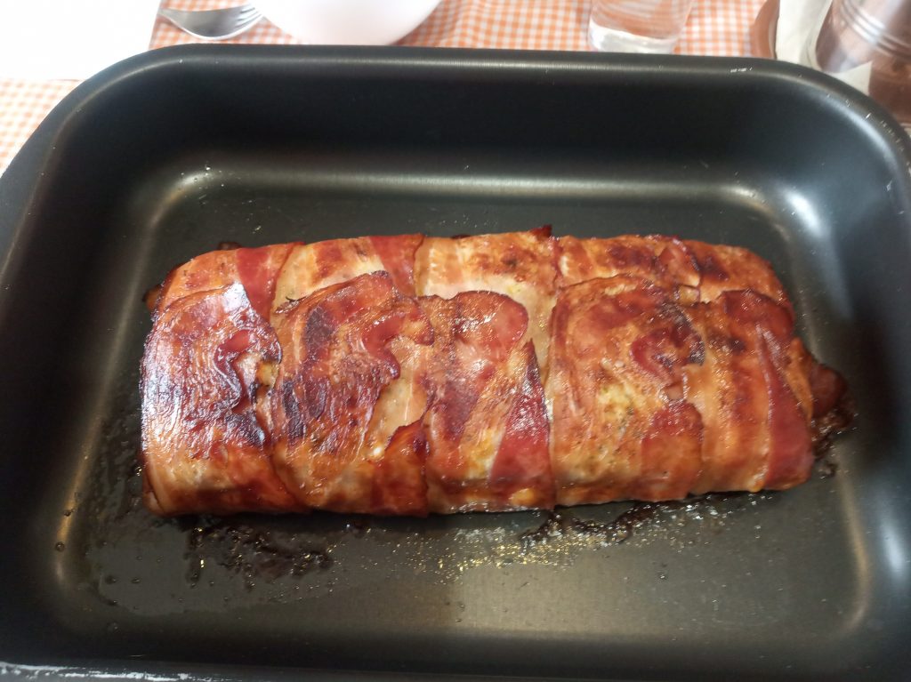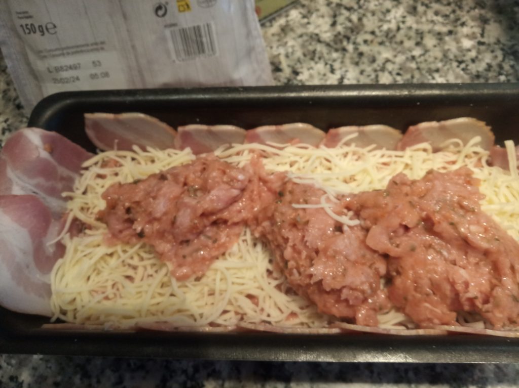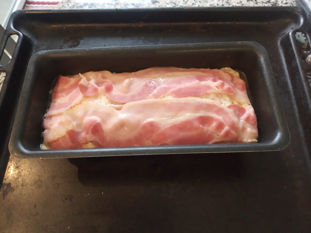 Cerramos encima los filos de bacón, si tienes y quieres, puedes tapar entero con bacón, pero no es necesario al ir para abajo al desmoldar.