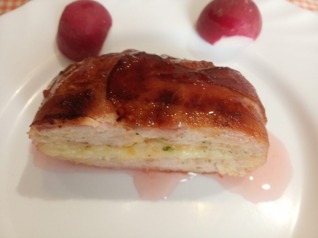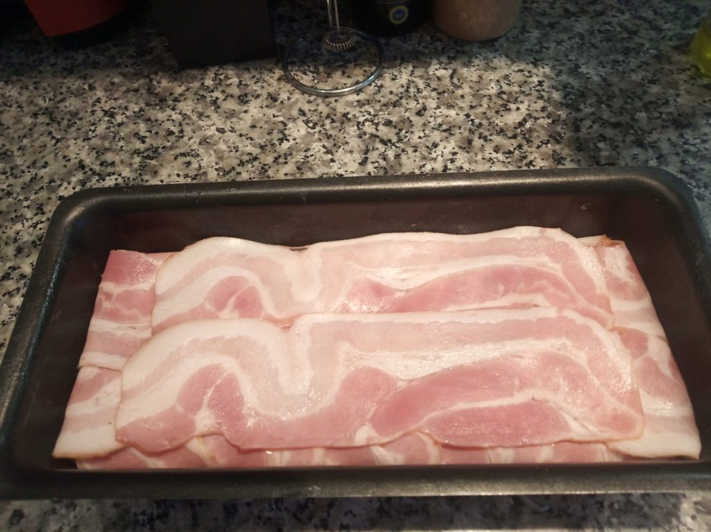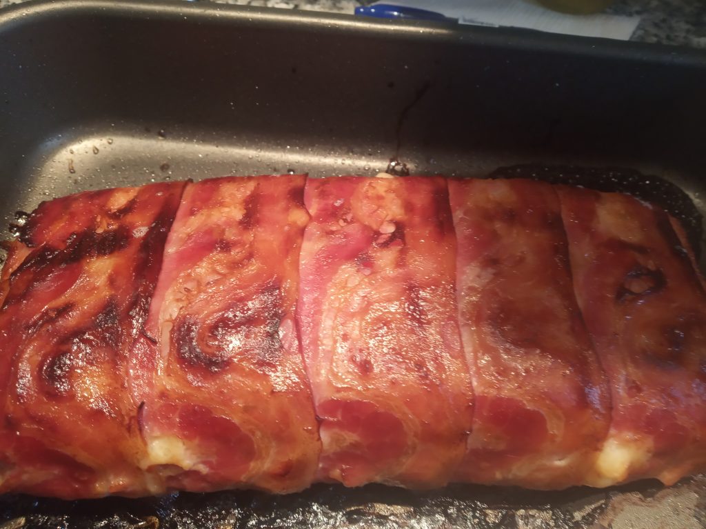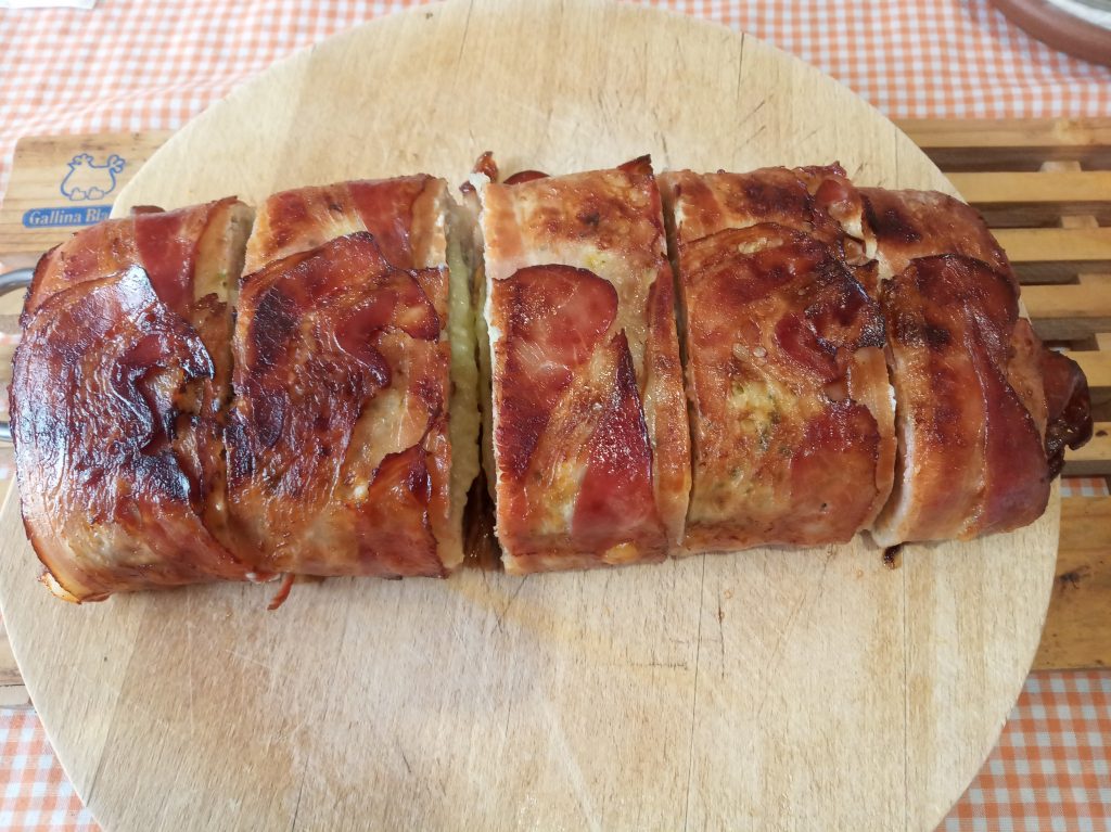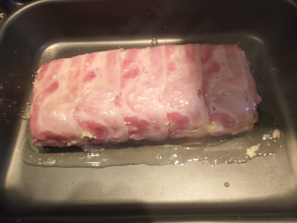 Cerramos encima los filos de bacón, si tienes y quieres, puedes tapar entero con bacón, pero no es necesario al ir para abajo al desmoldar.