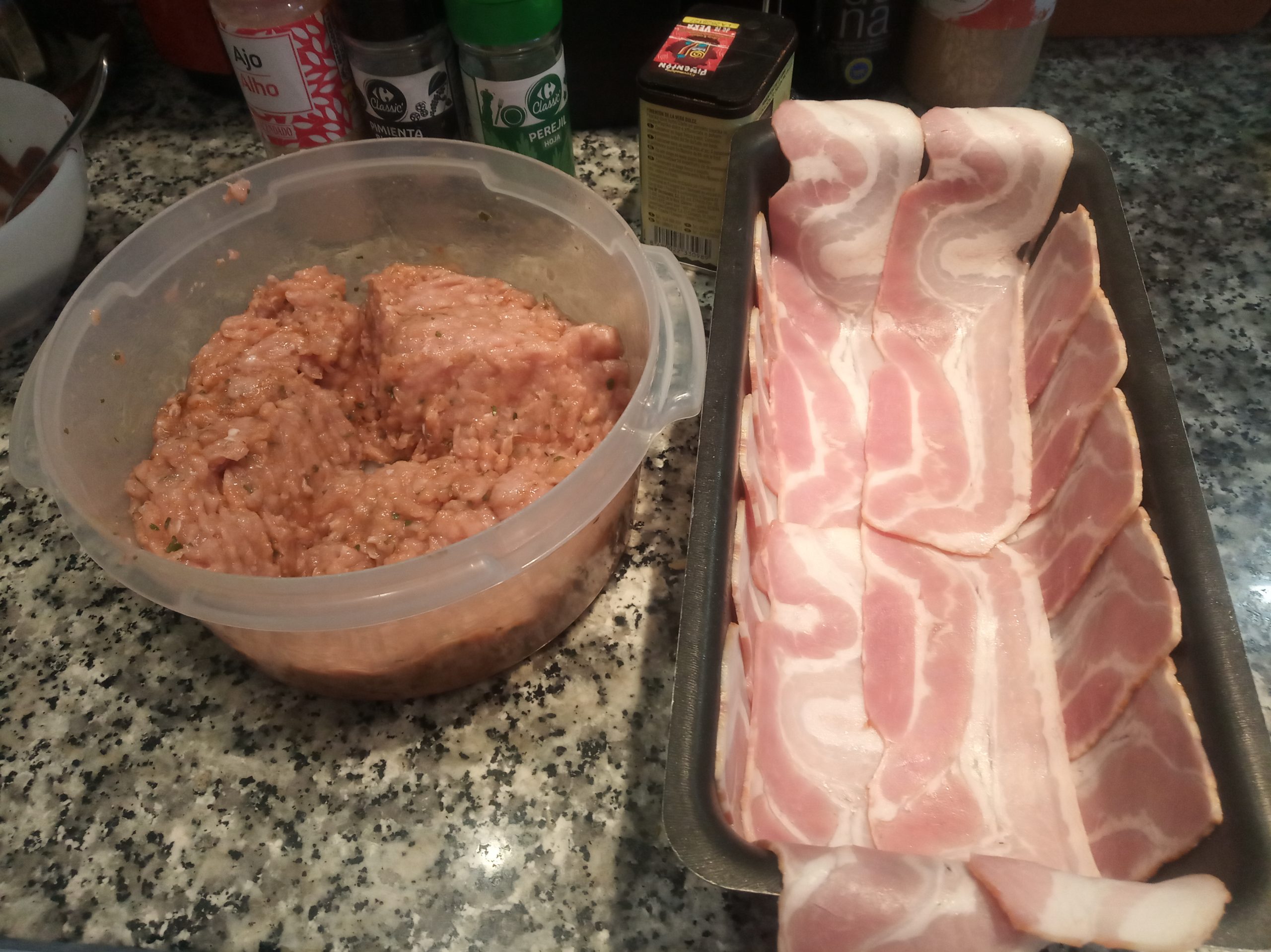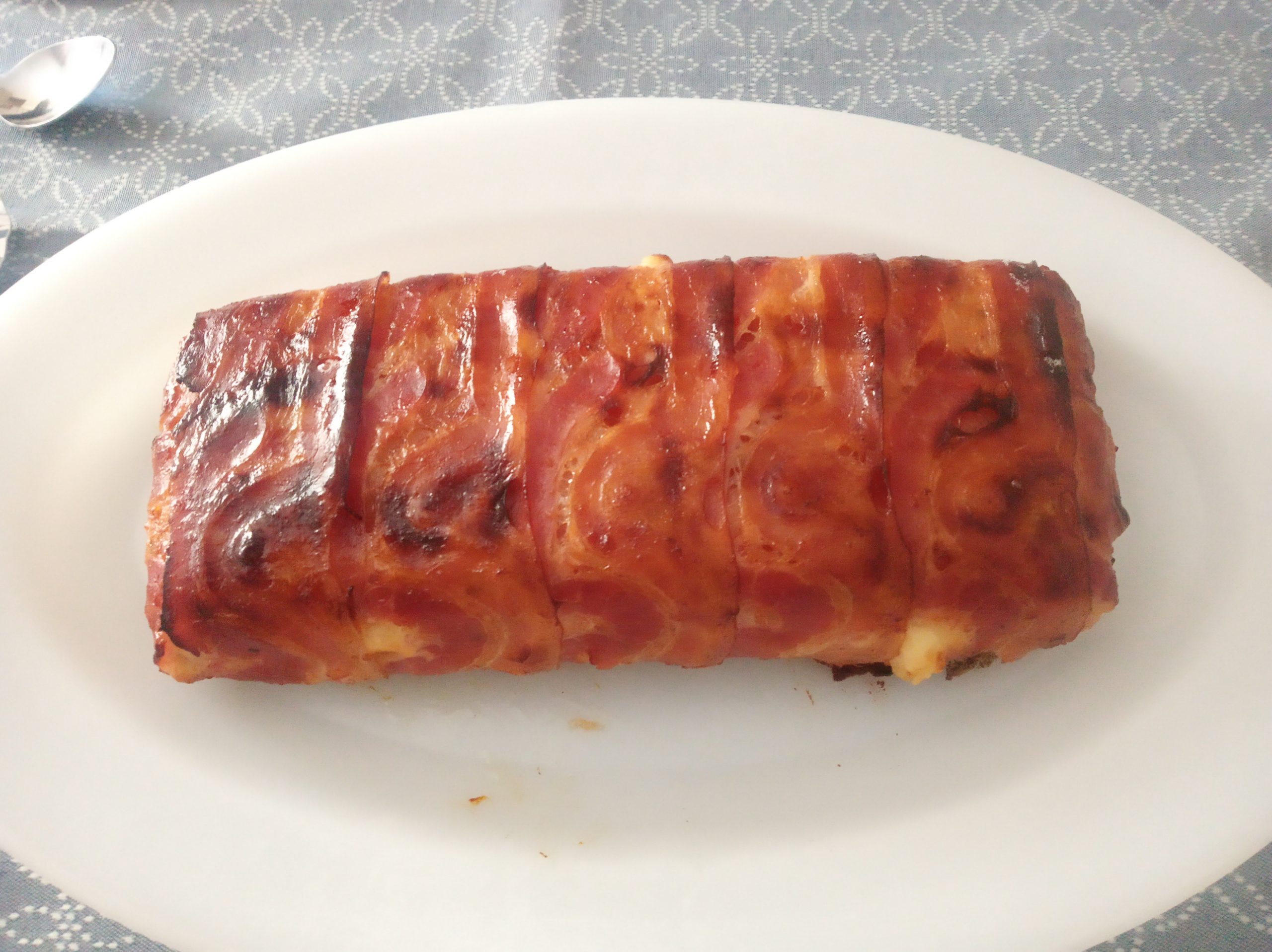 Cerramos encima los filos de bacón, si tienes y quieres, puedes tapar entero con bacón, pero no es necesario al ir para abajo al desmoldar.