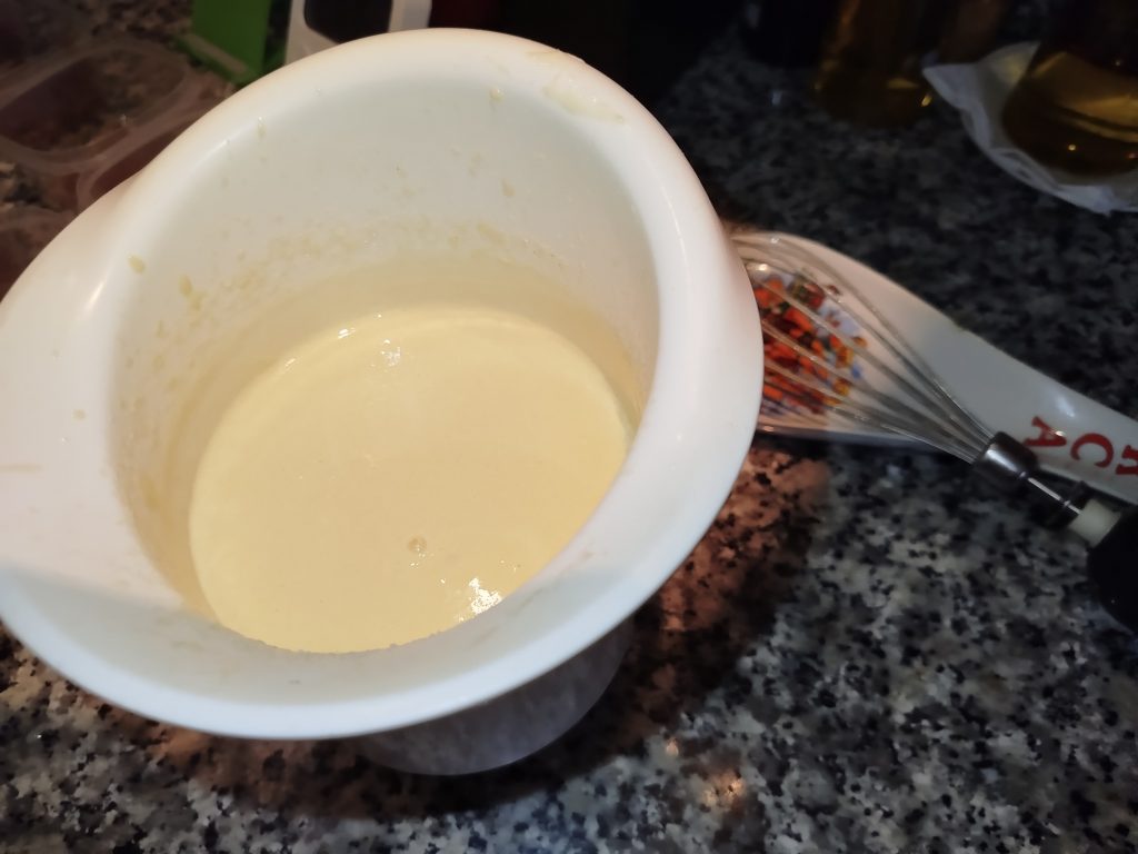 Echar el contenido de la base del preparado que viene en la caja, en 500 ml de leche entera, desnatada o de soja a temperatura ambiente.