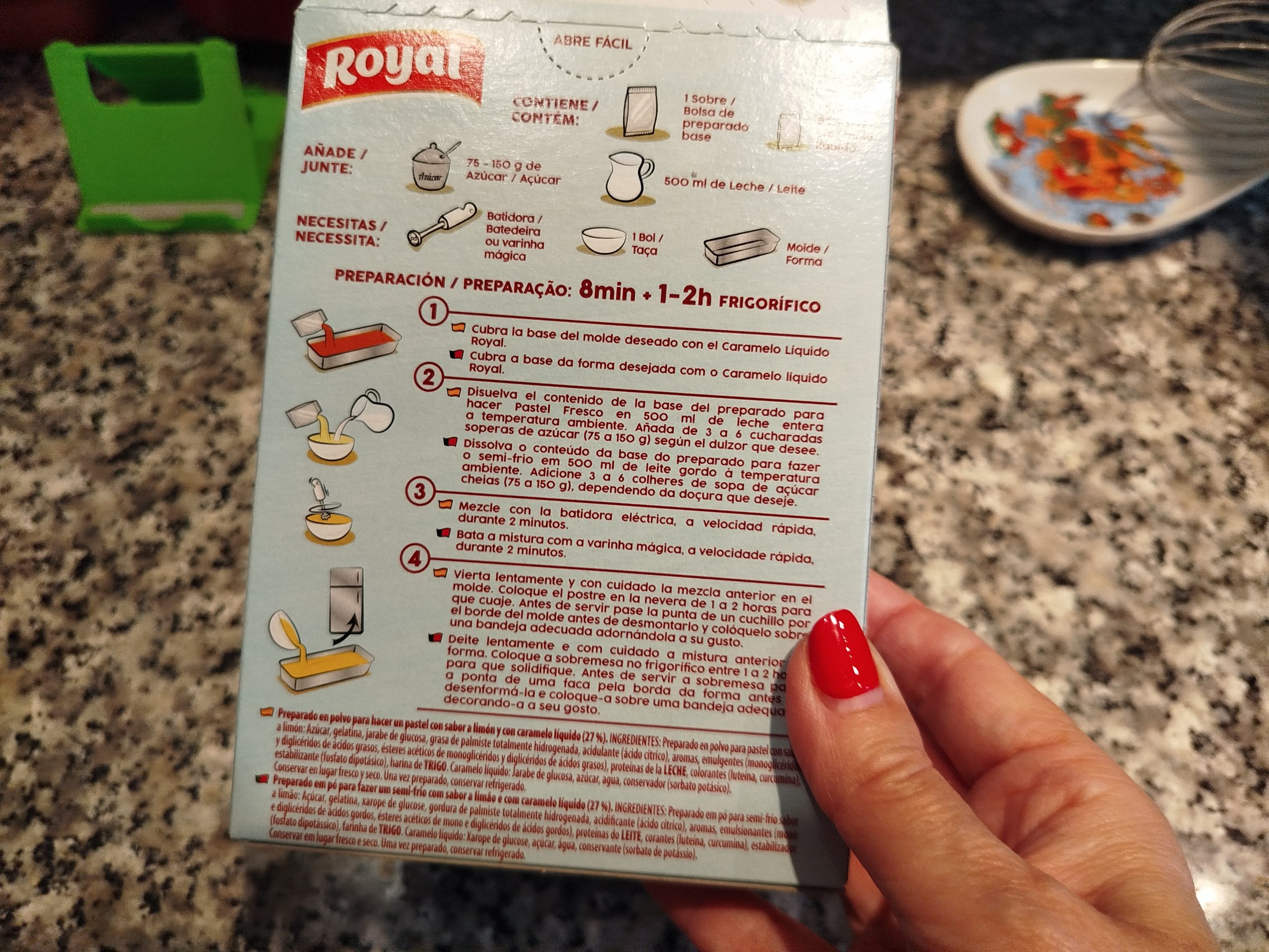 Echar el contenido de la base del preparado que viene en la caja, en 500 ml de leche entera, desnatada o de soja a temperatura ambiente.