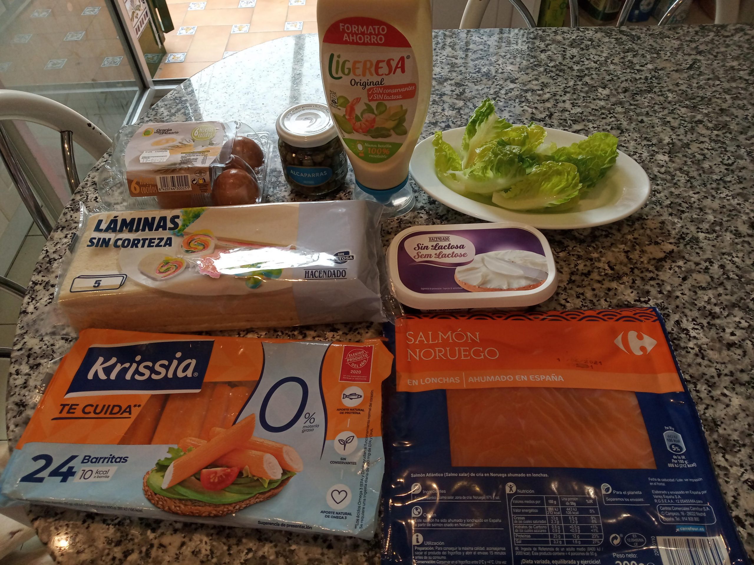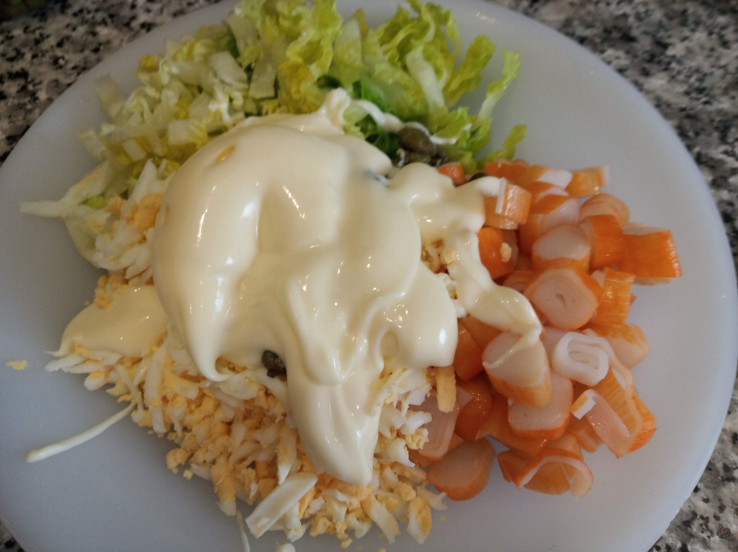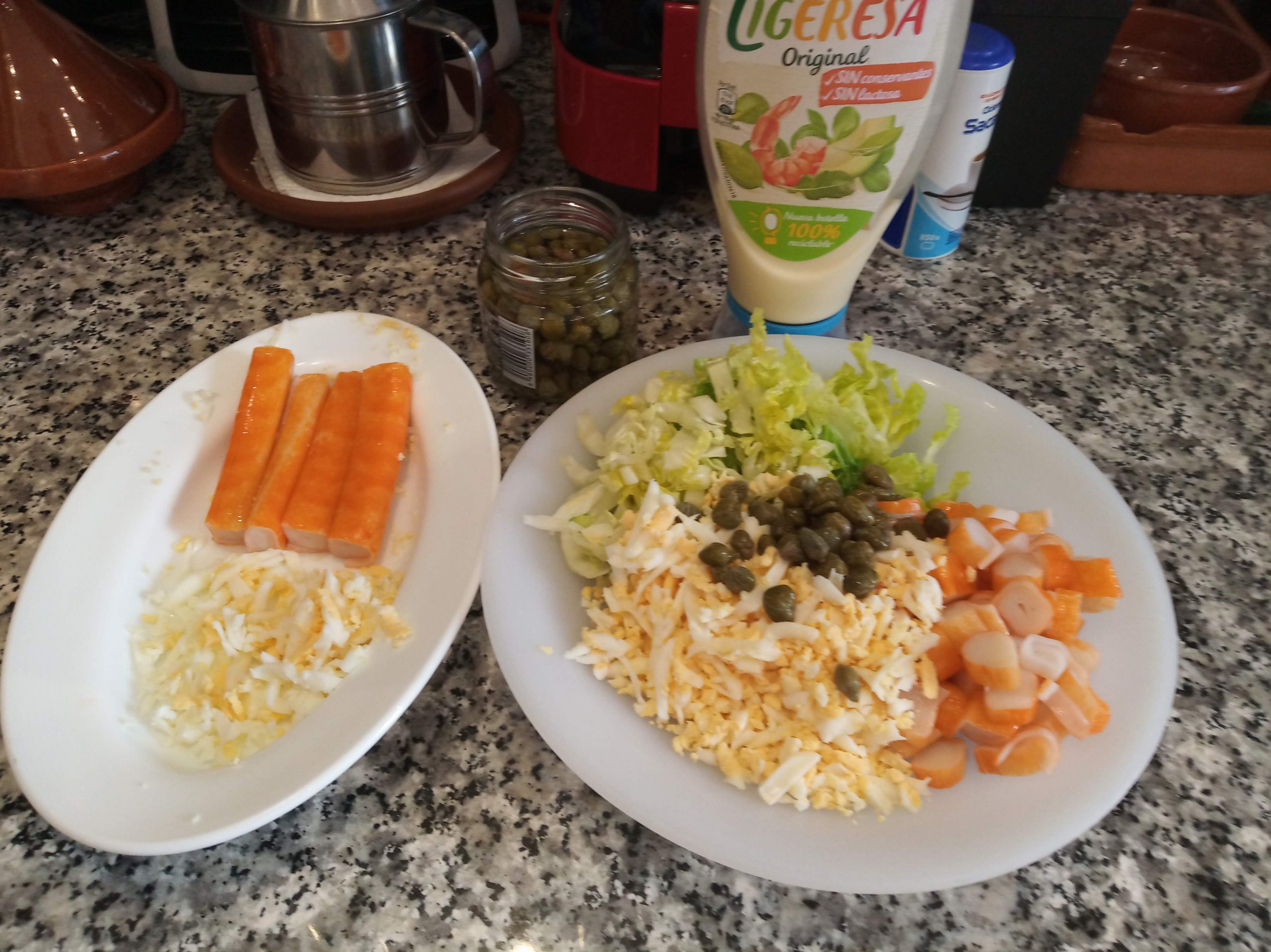 En un plato echar la lechuga, lavada y cortada muy finita, el huevo rallado (reserva un poco para decorar), 8 palitos de surimi en trocitos pequeños, puede ser rallado y algunos peinillos troceados o alcaparras, al gusto, reservar también algo para decorar.