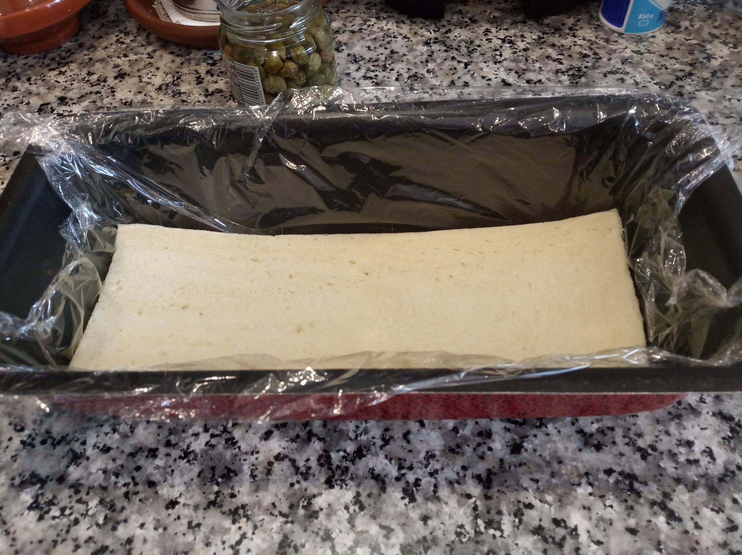 Poner en el molde el papel film transparente, para poder sacar luego el pastel a una bandeja.