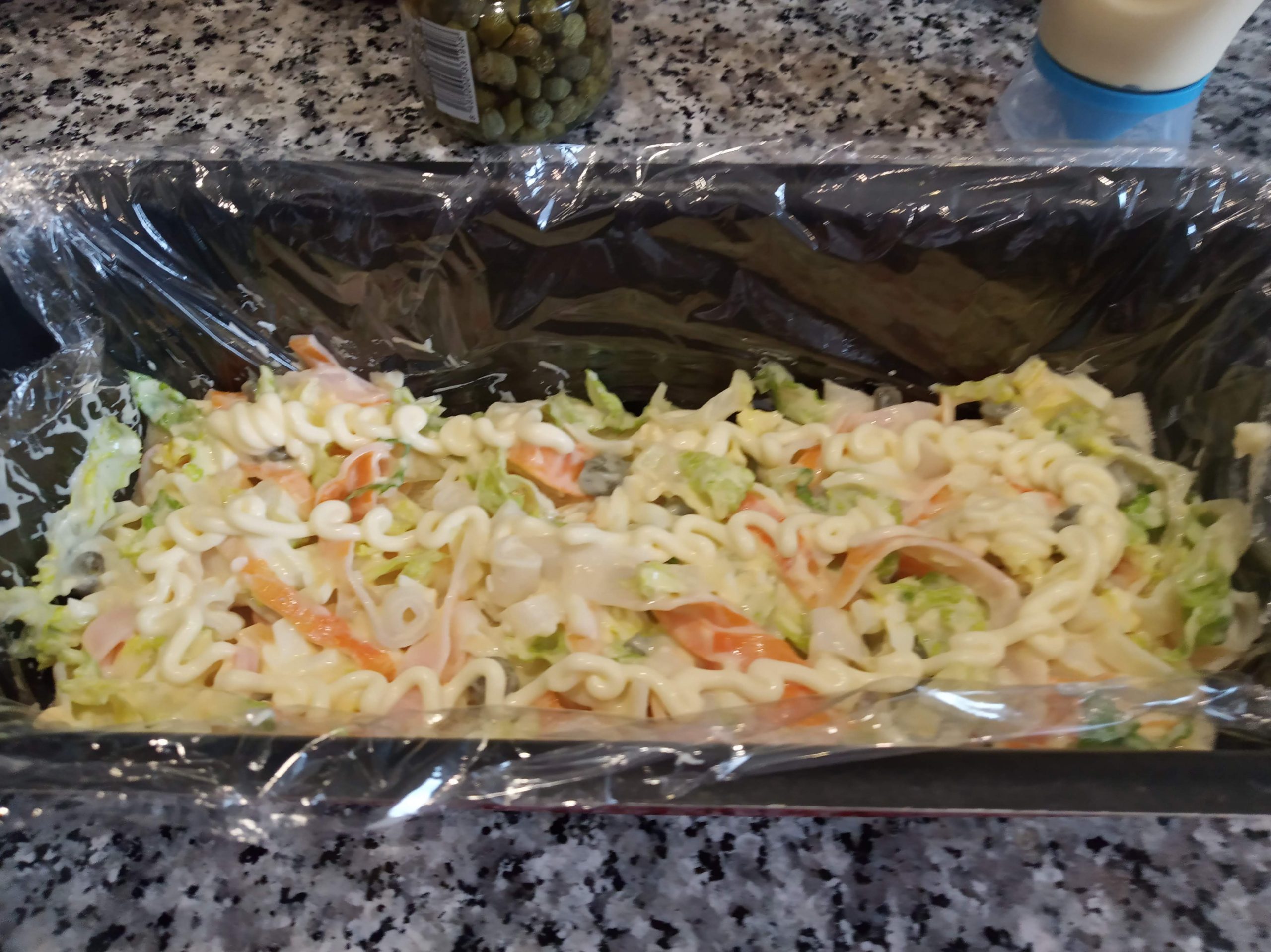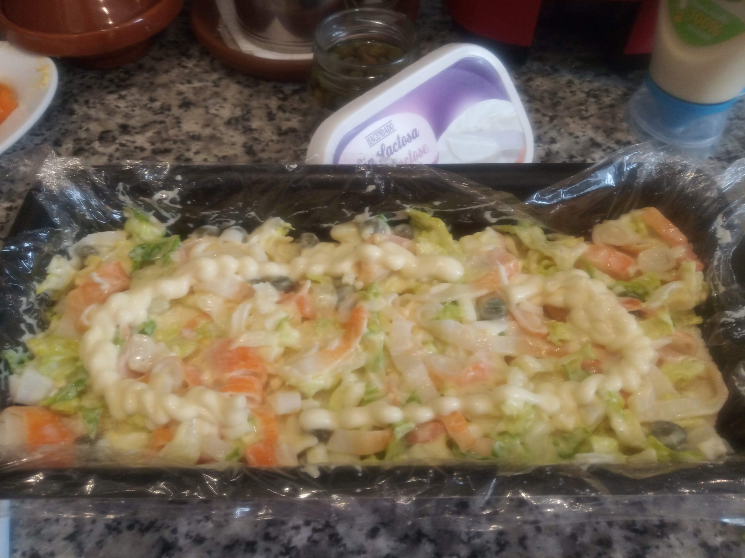 Ponemos en el fondo una loncha de pan de molde, echamos la mitad de este relleno, un poco de mayonesa por encima.