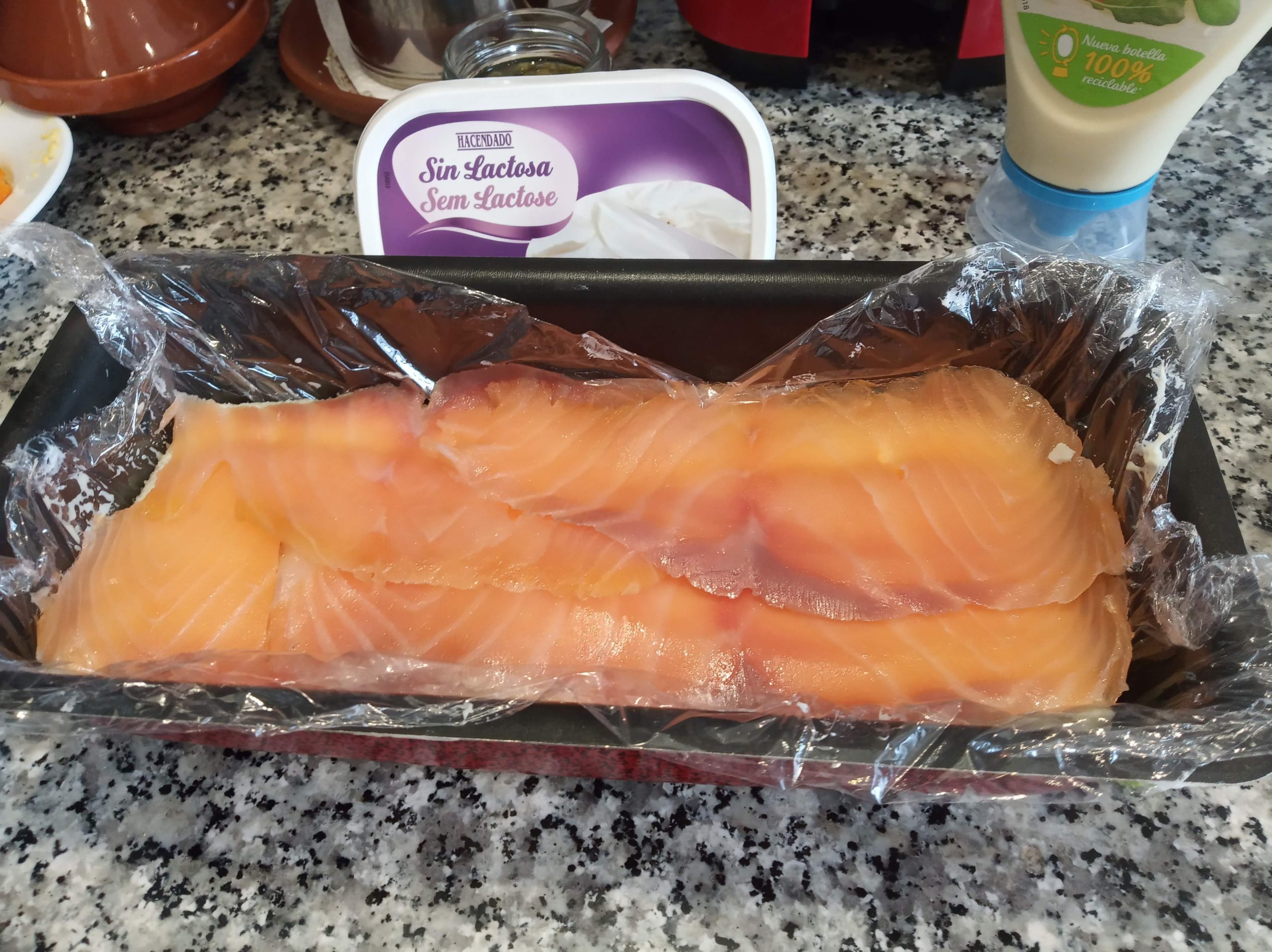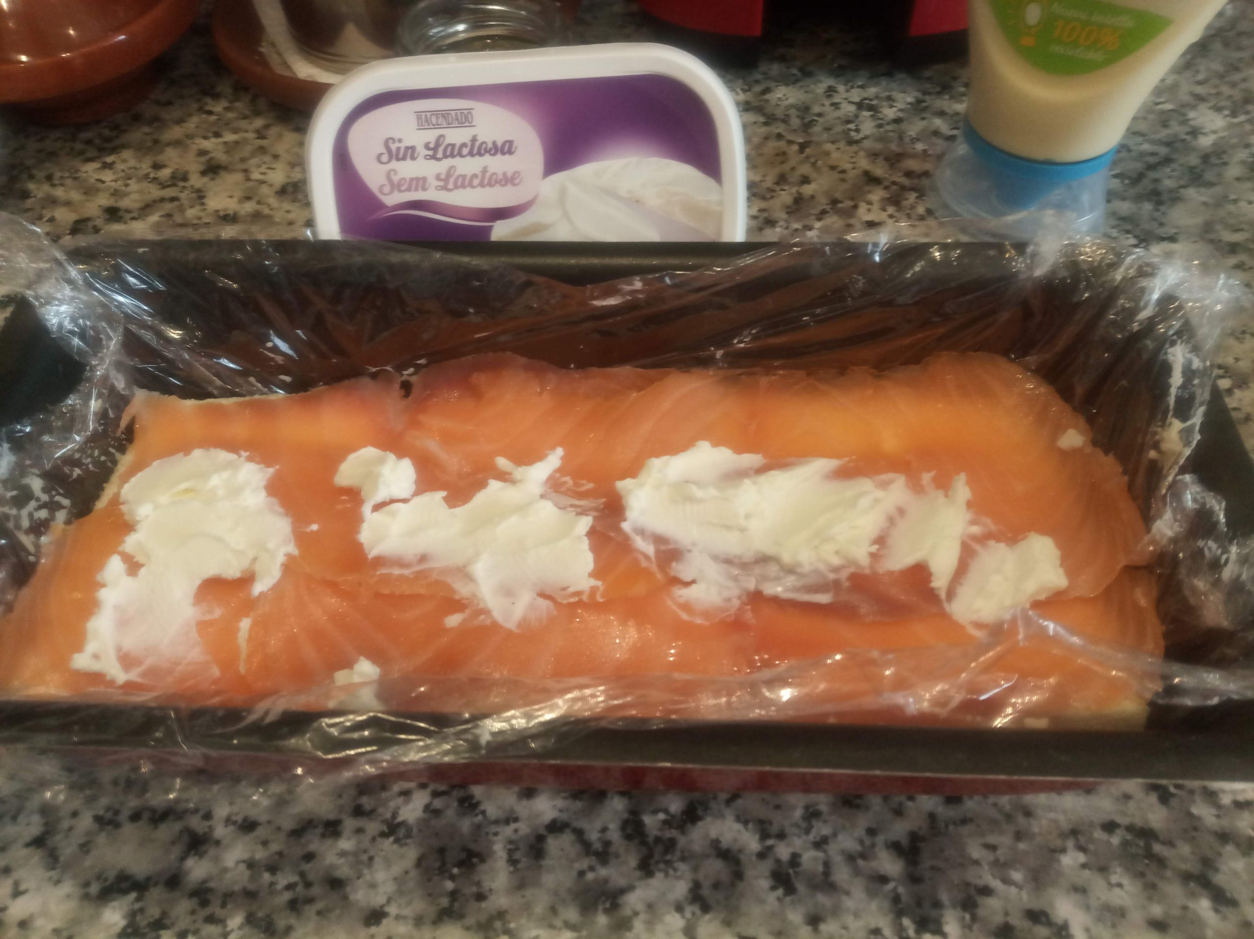 Le ponemos encima la mitad del salmón ahumado y unos trozos de queso de untar.