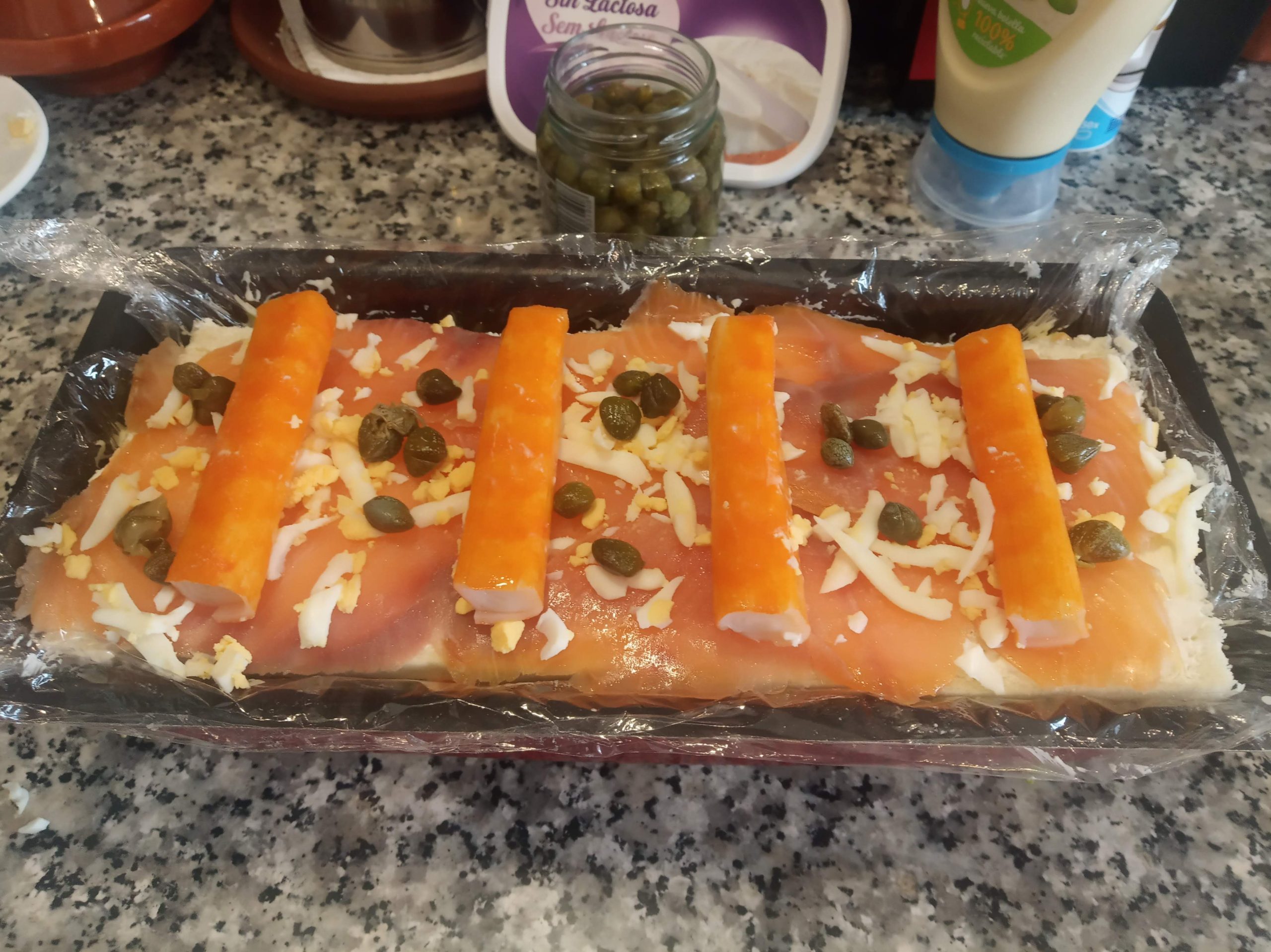 Adornamos con el huevo rallado, y los palitos de surimi, y algunos pepinillos troceados o alcaparras.