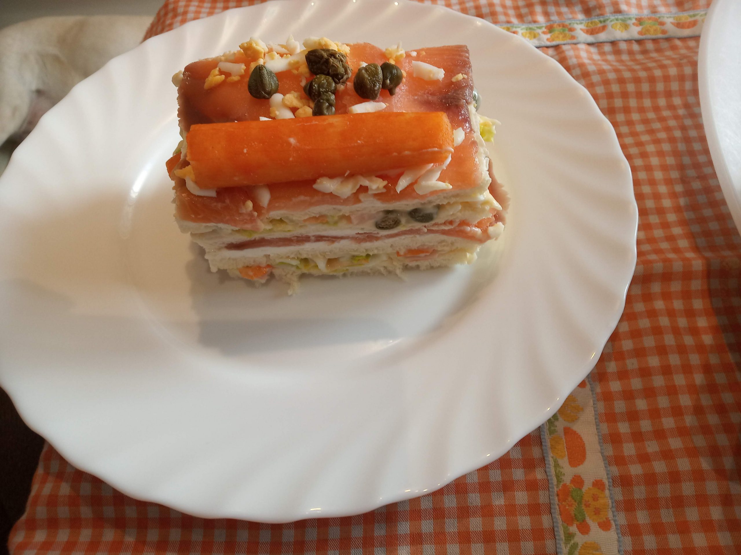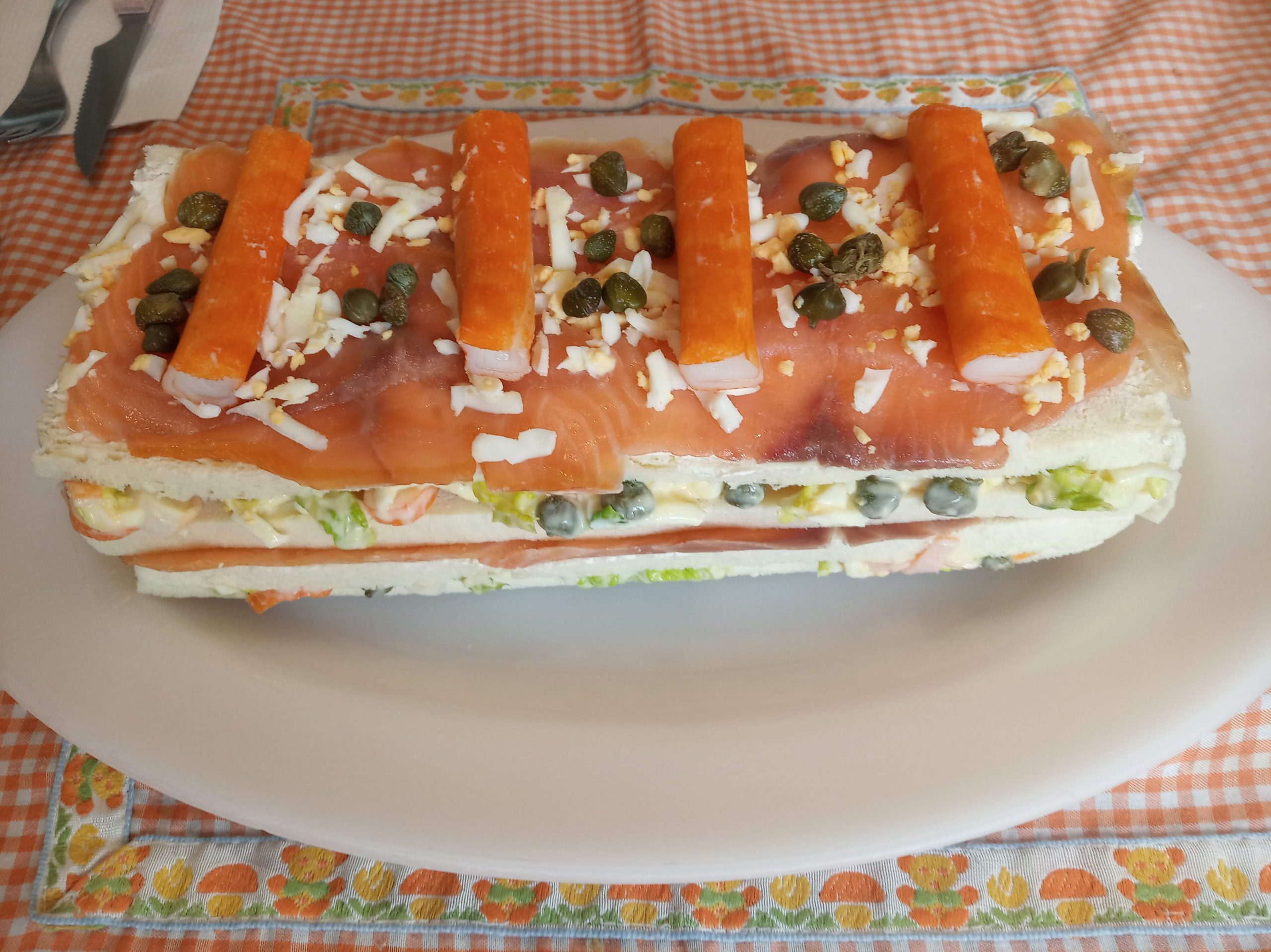 Volvemos a repetir juntando de queso otra loncha, la colocamos, encima, y el resto del salmón ahumado.