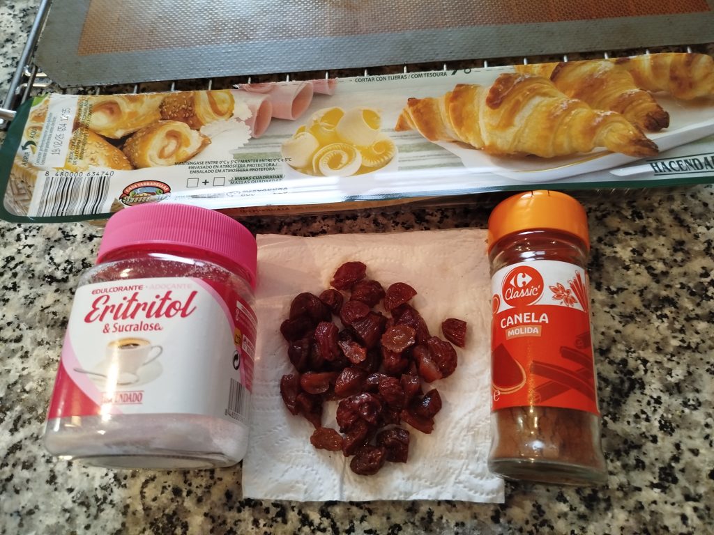 Pastelitos de hojaldre con azúcar o Eritritol y un poco de canela y pasas a tu gusto