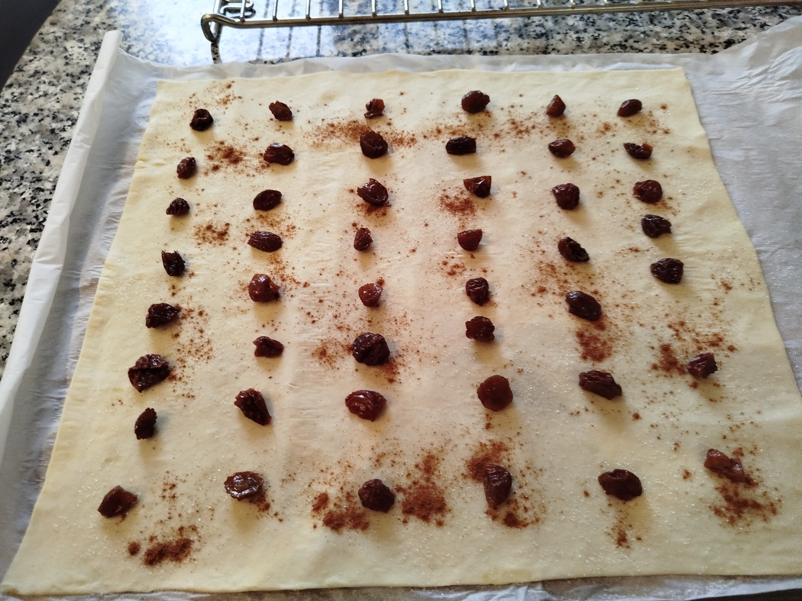 Suelo poner debajo un tapete de silicona. Extender la masa de hojaldre sobre su mismo papel, repartir por encima un poco de azúcar o Eritritol, la canela molida y por ultimo las pasas.