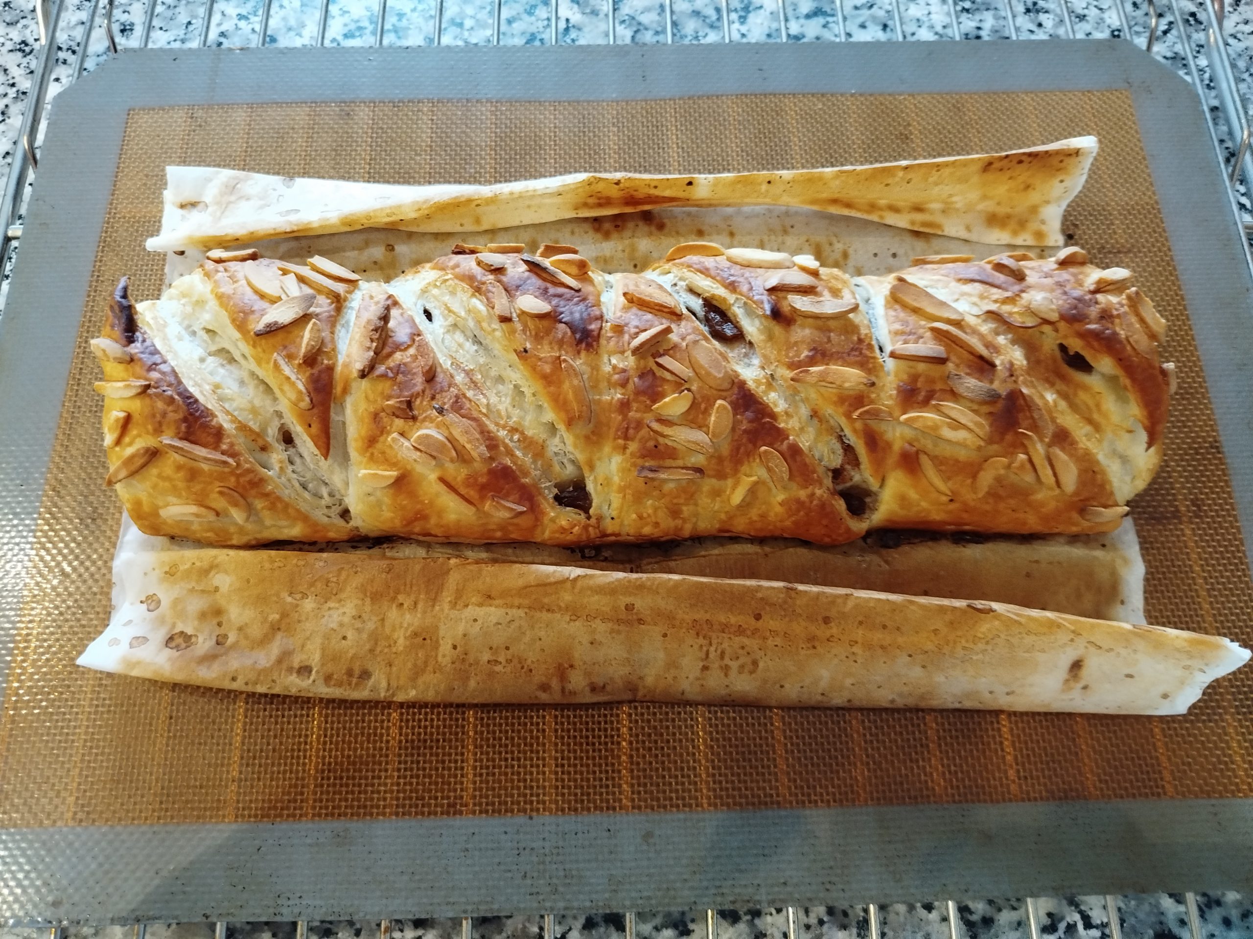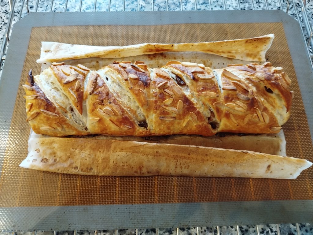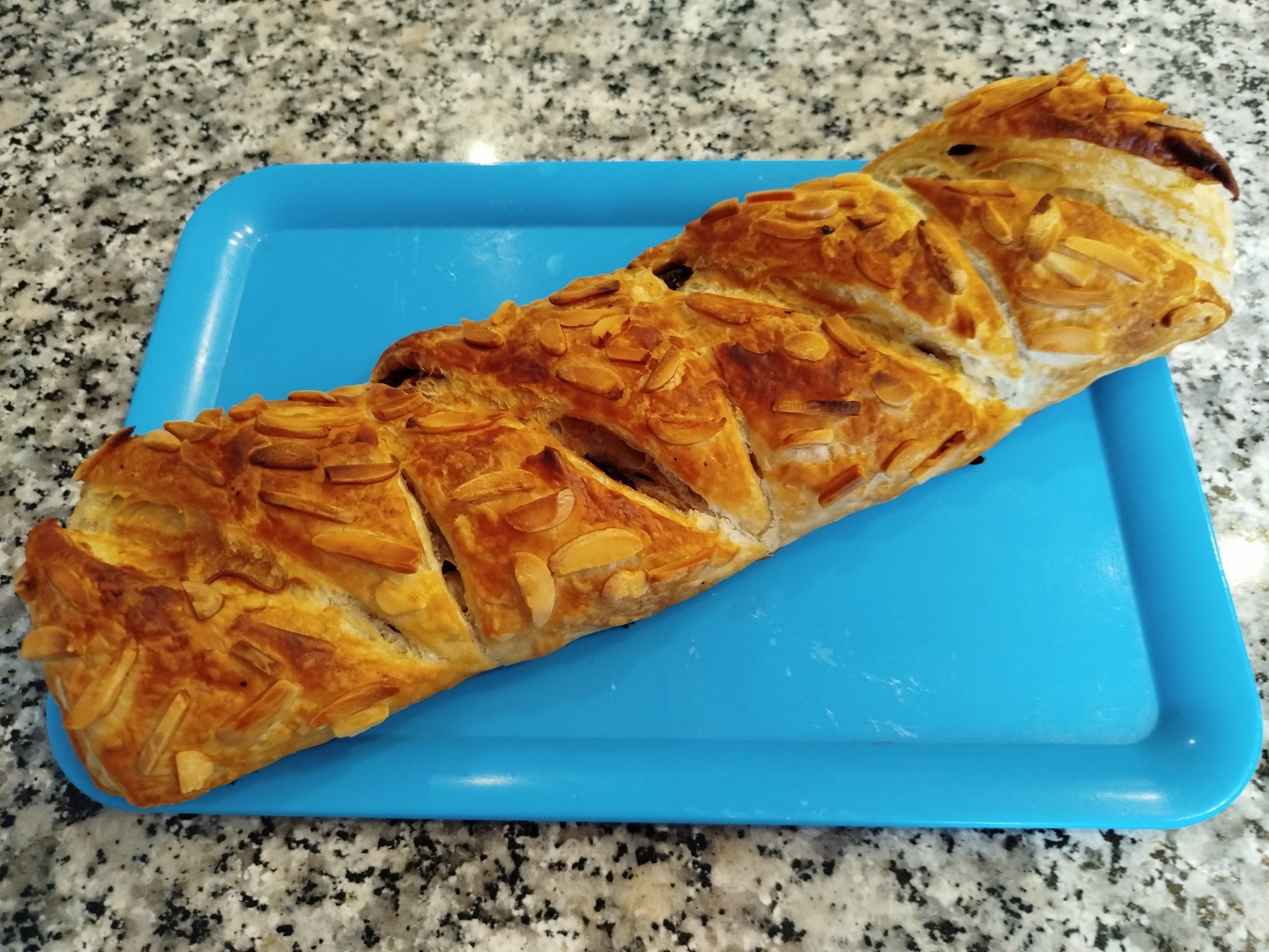 Pintar el hojaldre con huevo batido o leche, echar un poquito de azúcar o Eritritol y marcar el hojaldre haciendo triángulos, repartir por encima almendras laminadas o en tiras crudas.