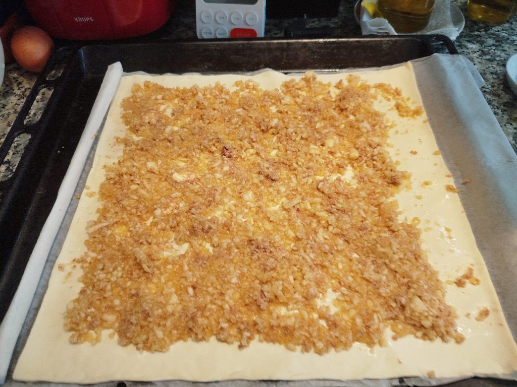 Extender la masa de hojaldre, en su mismo papel, en la bandeja de horno, repartir la mezcla de manzana, y extender bien, sin llegar al filo.