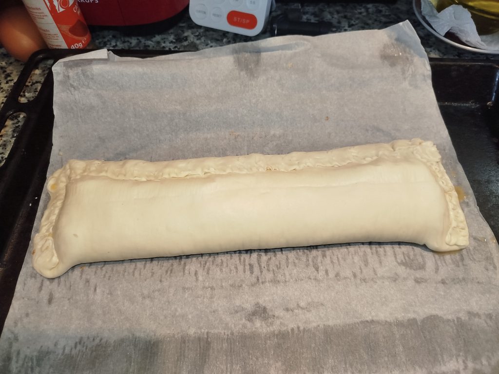 Enrollar el hojaldre, cerrar los filos muy bien, dar la vuelta para dejar el cierre para abajo.