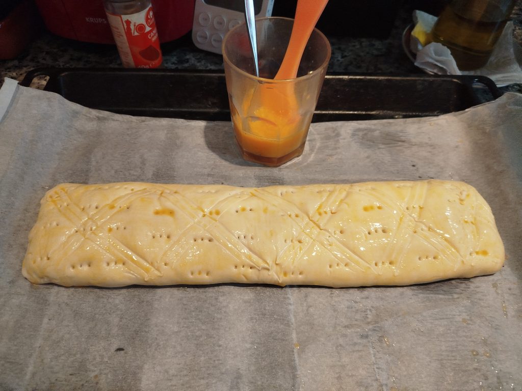 Pinchar el hojaldre con un tenedor, pintar con huevo batido, y pasar el tenedor, hacia un lado y luego para el otro lado, quedando unos rombos.
