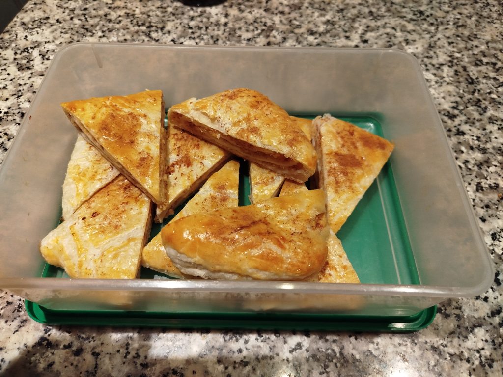 Sacar del horno, pintar con sirope de agave y un poco de canela molida, o por un poco de azúcar y canela, y dejar enfriar, para luego cortarlo en triángulos, presentarlo cortado en una bandeja, o guardar en un táper, para tomarlo poco a poco, en meriendas, desayuno, cuando tengas ganas.