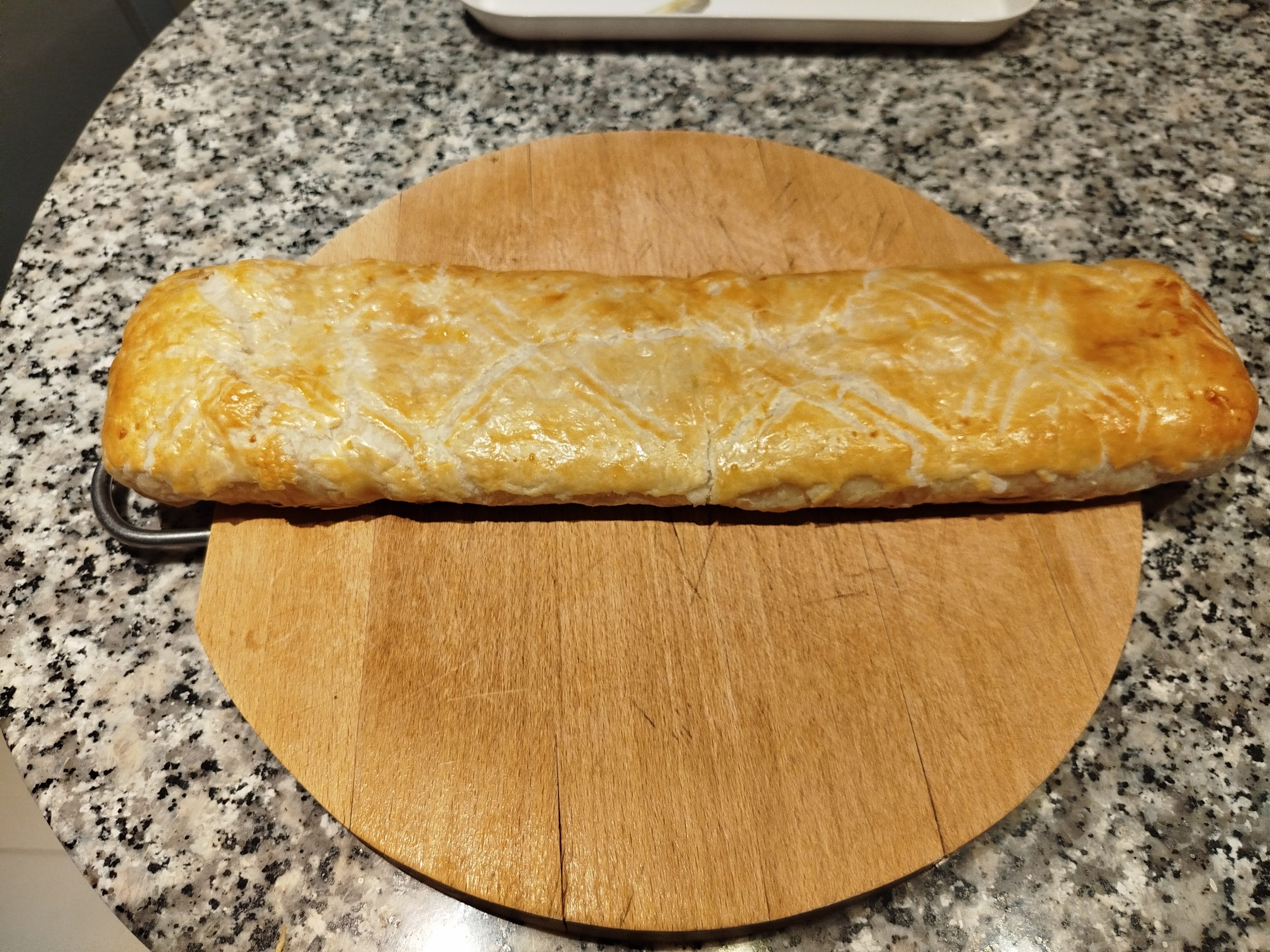 Enrollar el hojaldre, cerrar los filos muy bien, dar la vuelta para dejar el cierre para abajo.