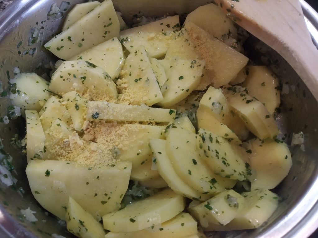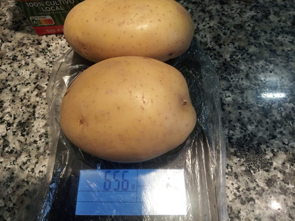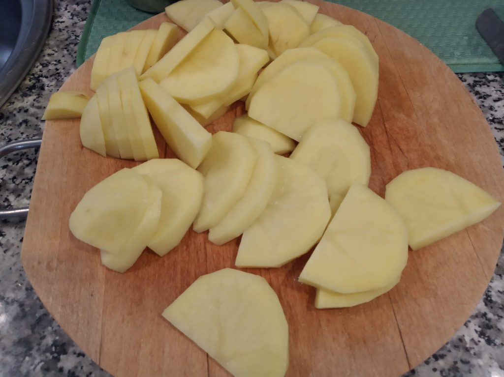 Pelar las patatas y cortarlas en rodajas, no muy fina, si es muy grande, cortar por la mitad.