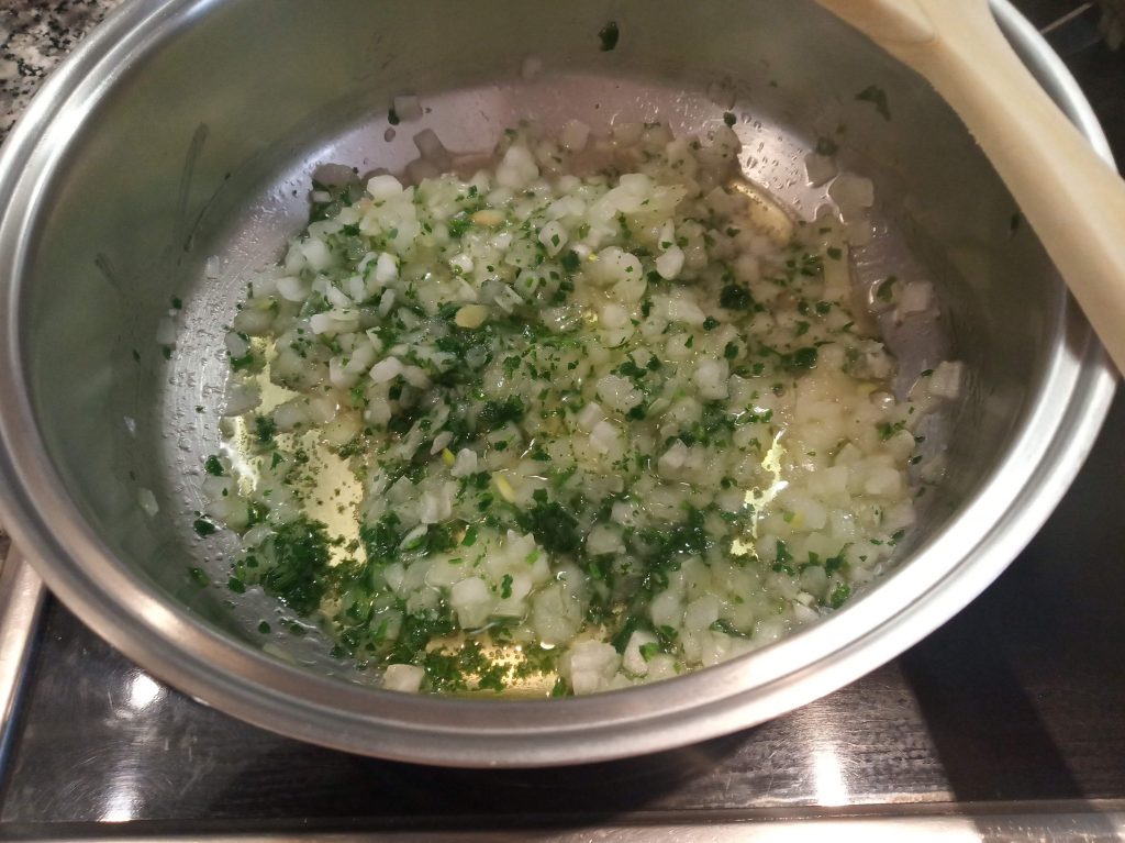 Cortar la cebolla y poner la mantequilla en una sarten o cacerola, echar la cebolla y el perejil, y sofreírla un poco.