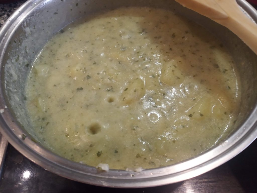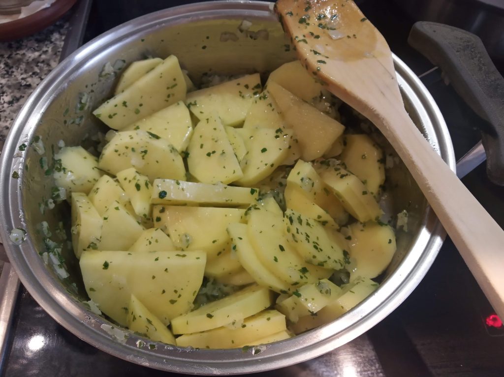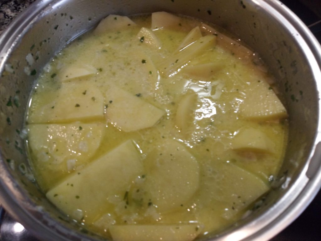 Añadir la leche, mezclar todo, y dejar cocer a fuego lento, unos 20 minutos, hasta que las papas estén tiernas.