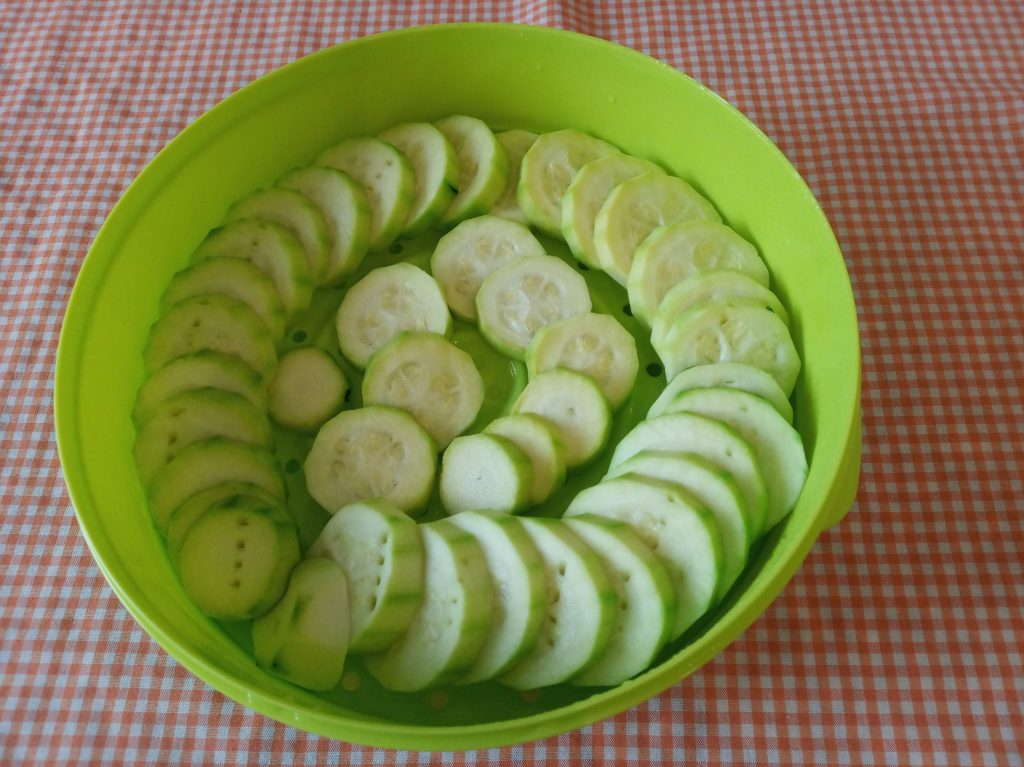 Cortar el calabacín en rodajas de ½ dedos de ancho.