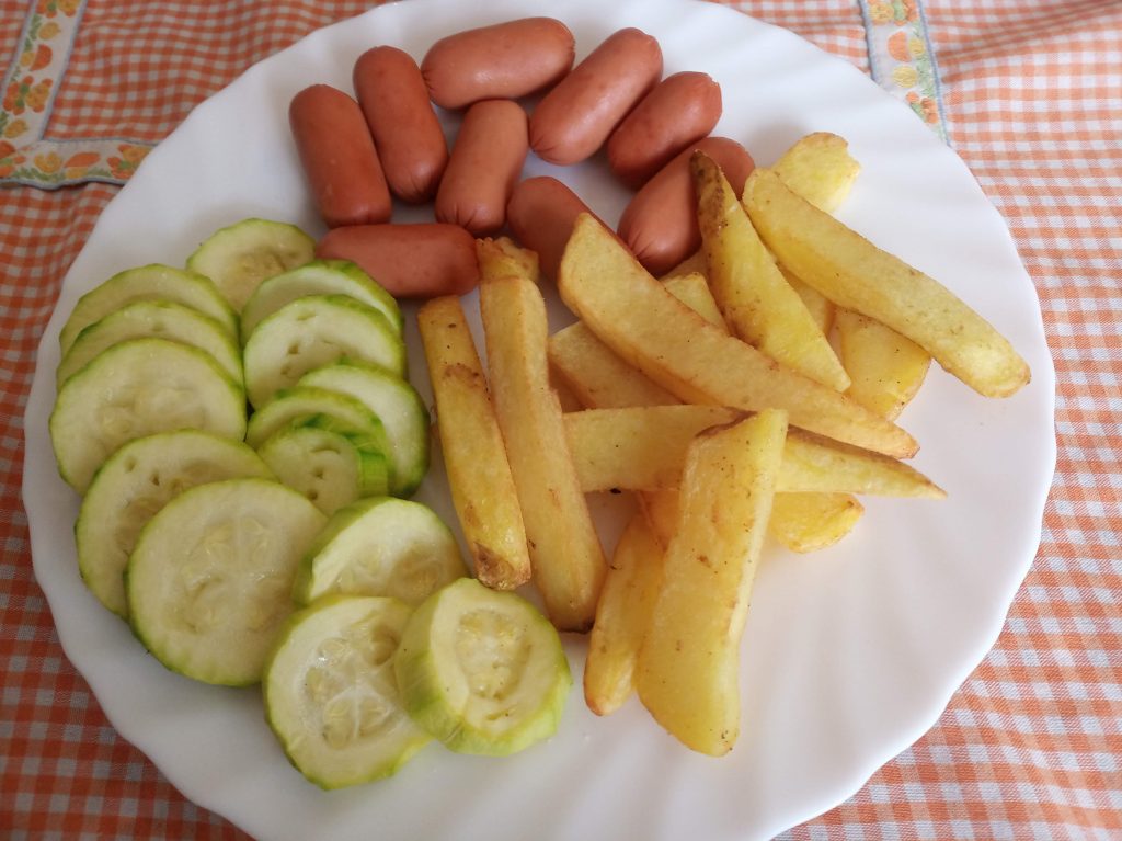 Repartir en el mismo plato, las salchichas, las patatas y el calabacín, con un poco de sal fina y aceite de oliva.