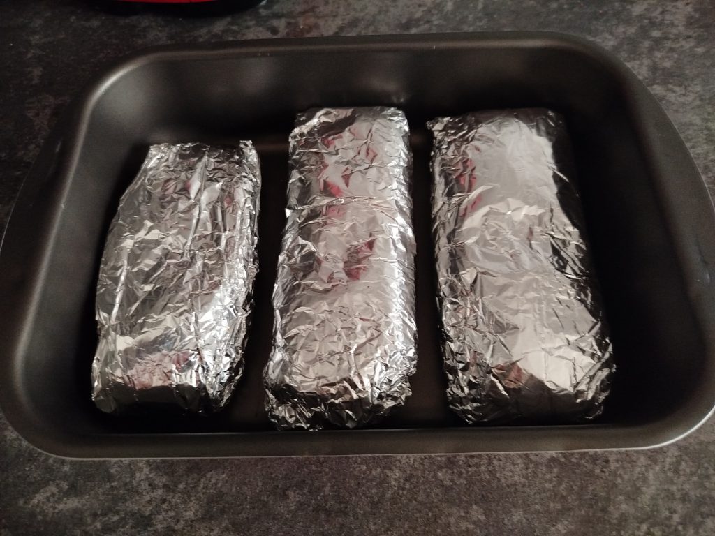 Sacar del frigorífico, y colocar cada pechuga sola o con su solomillo, sobre papel de aluminio, cerrar muy bien, y colocar en una bandeja apta para el horno.