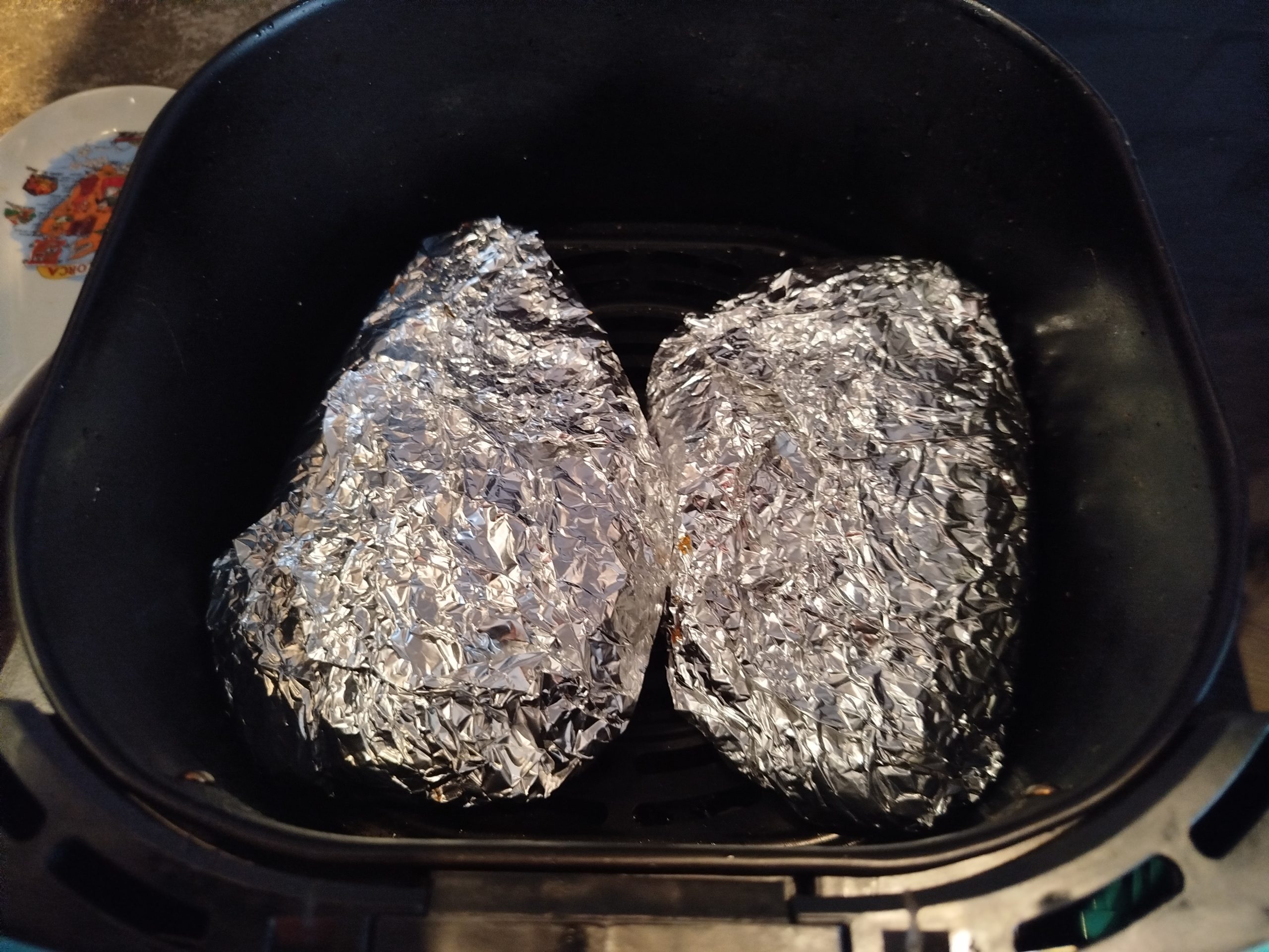 • Si lo haces en la freidora de aire, calentar a 200 grados durante unos 5 minutos, y colocar en el cestillo las pechugas con el papel de aluminio, elegir pollo o hacer a 200 grados durante 20 minutos.