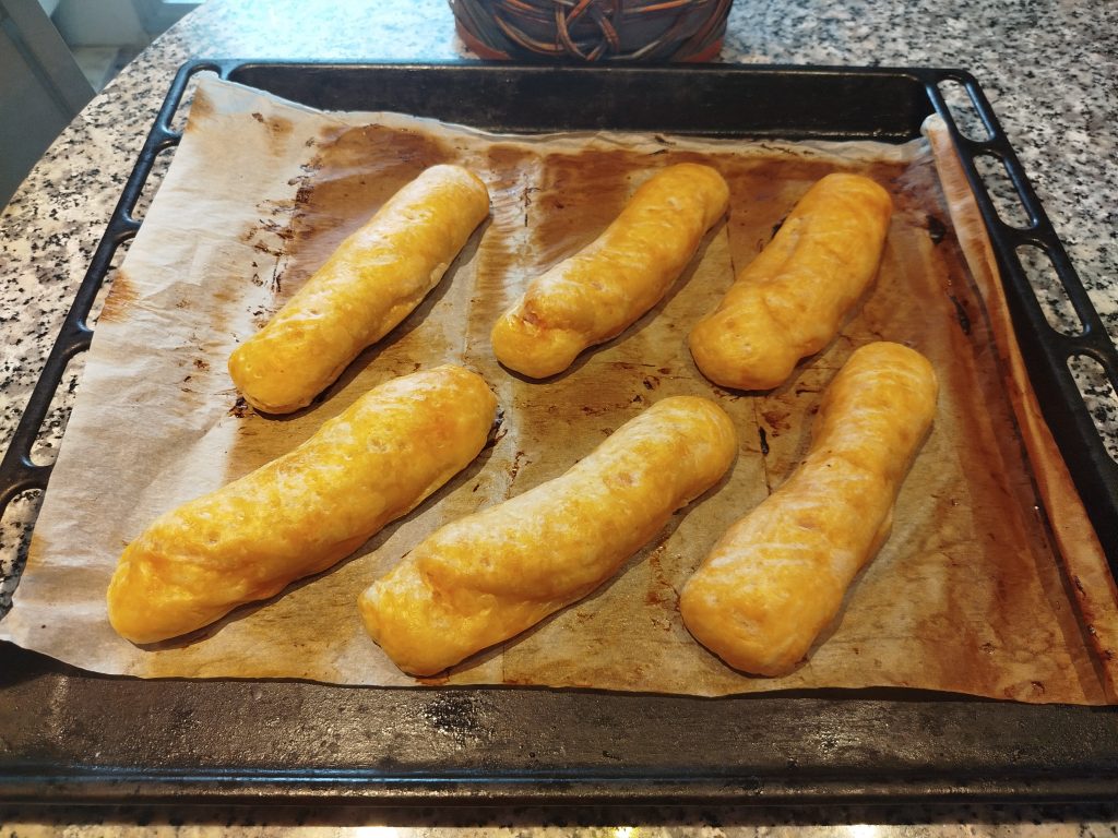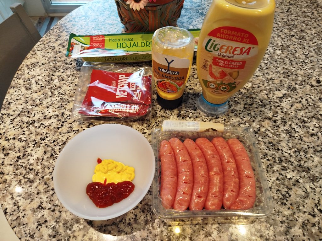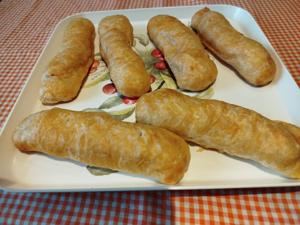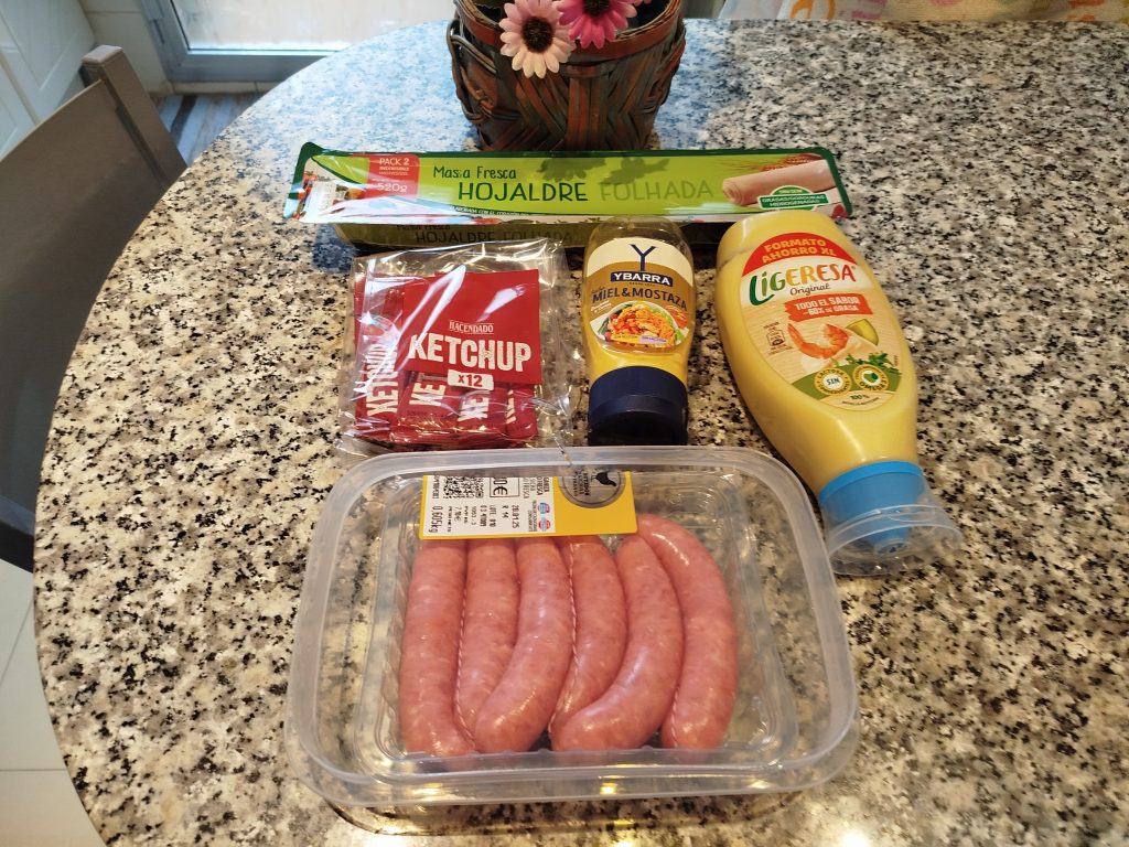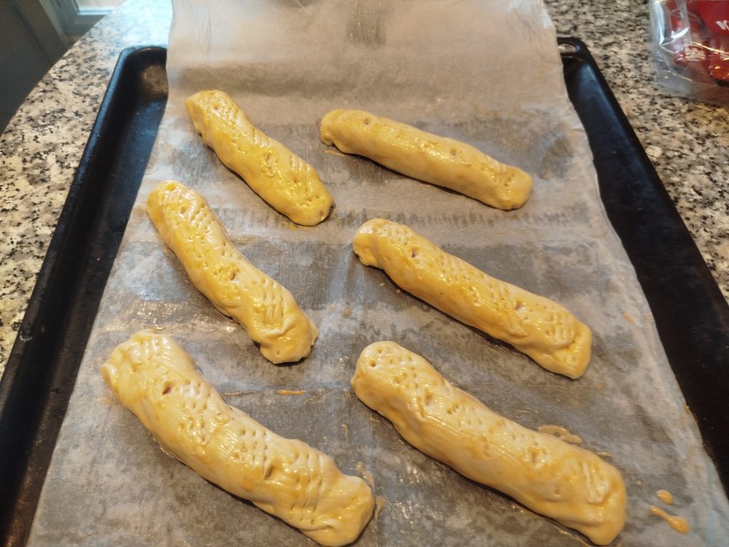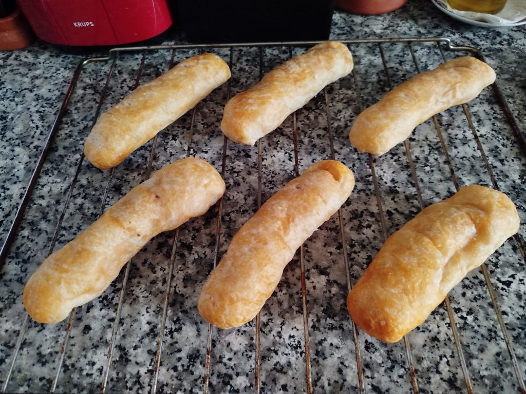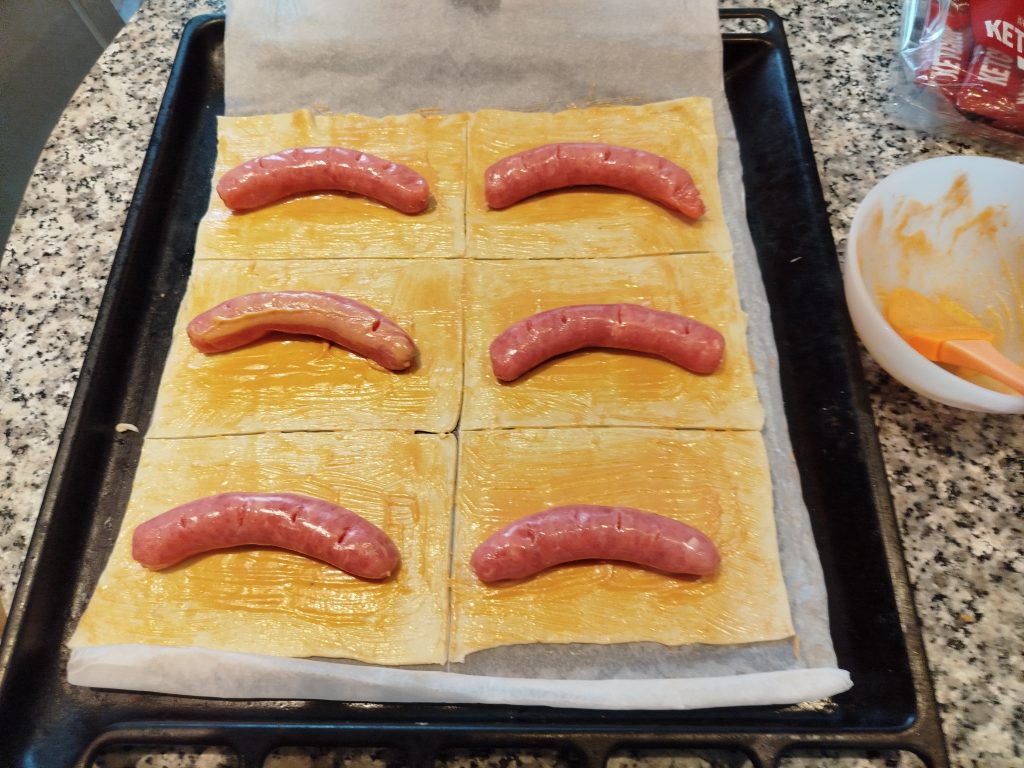 Pintar la masa de hojaldre con el preparado en el bol, colocar una longaniza en el filo, y enrollar, cerrar bien los filos de los lados, como el del centro.