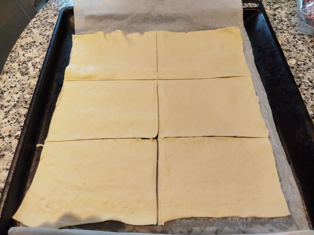 Extender la masa de hojaldre, en su mismo papel, en la placa de horno, cortar la masa por la mitad y luego en 3 trozos iguales, cada parte, quedando 6 cuadrados.