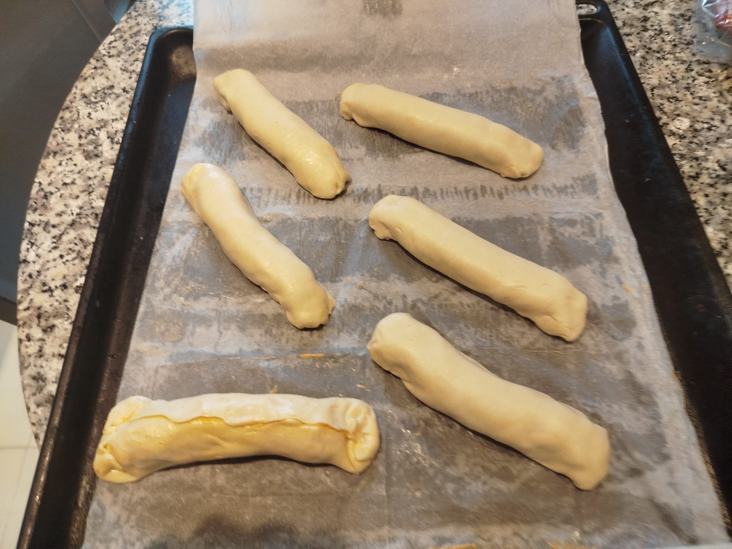 Pintar la masa de hojaldre con el preparado en el bol, colocar una longaniza en el filo, y enrollar, cerrar bien los filos de los lados, como el del centro.
