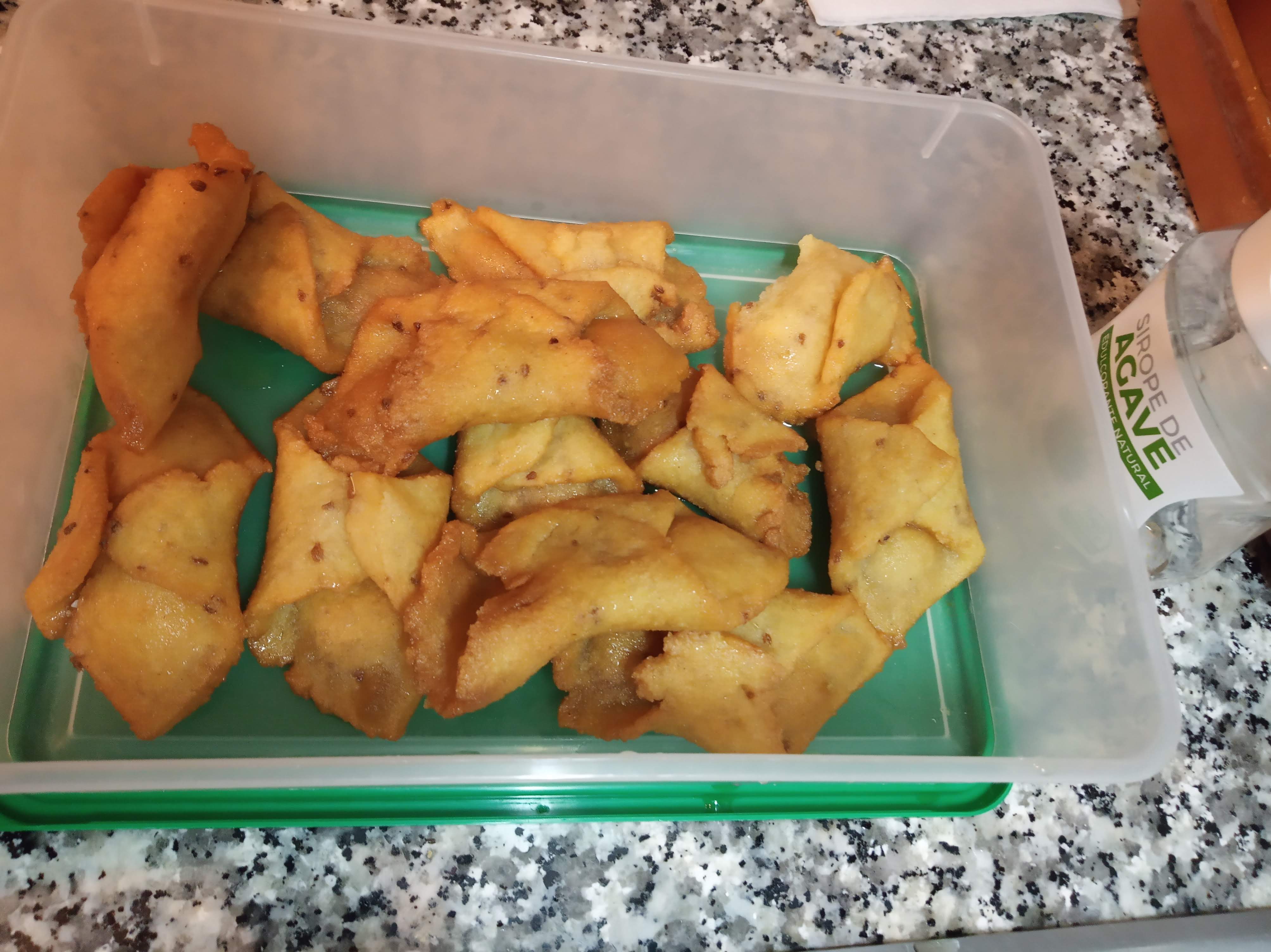 Poner el aceite a calentar, en una sartén o freidora, e ir friendo los pestiños con la unión para abajo, cuando flote dar la vuelta y sacar a escurrir en un plato, con papel de cocina.