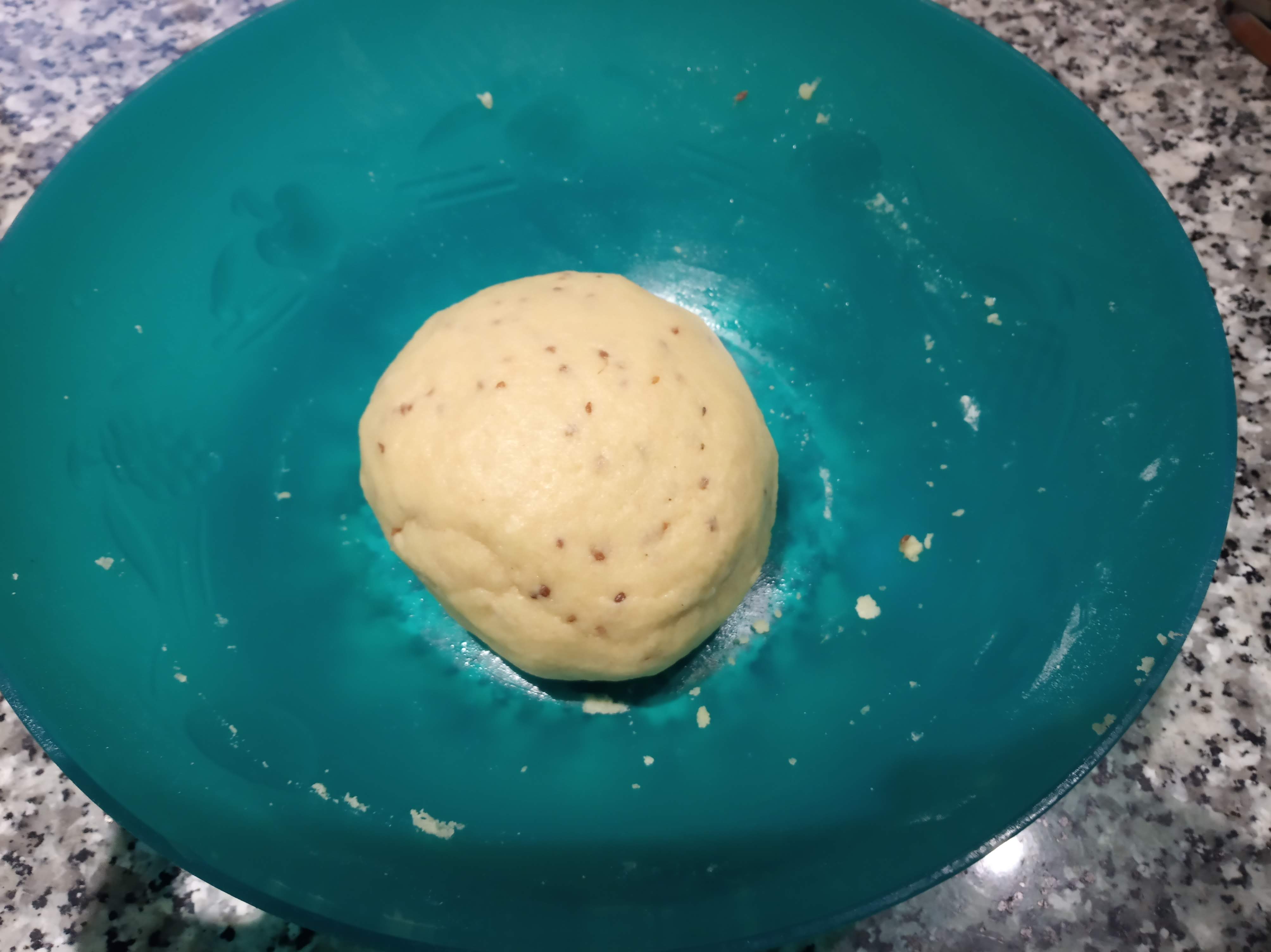 Volcar en la encimera y trabajar la masa hasta que no se pegue, hacer una bola y dejar en el bol que repose durante 30 minutos.