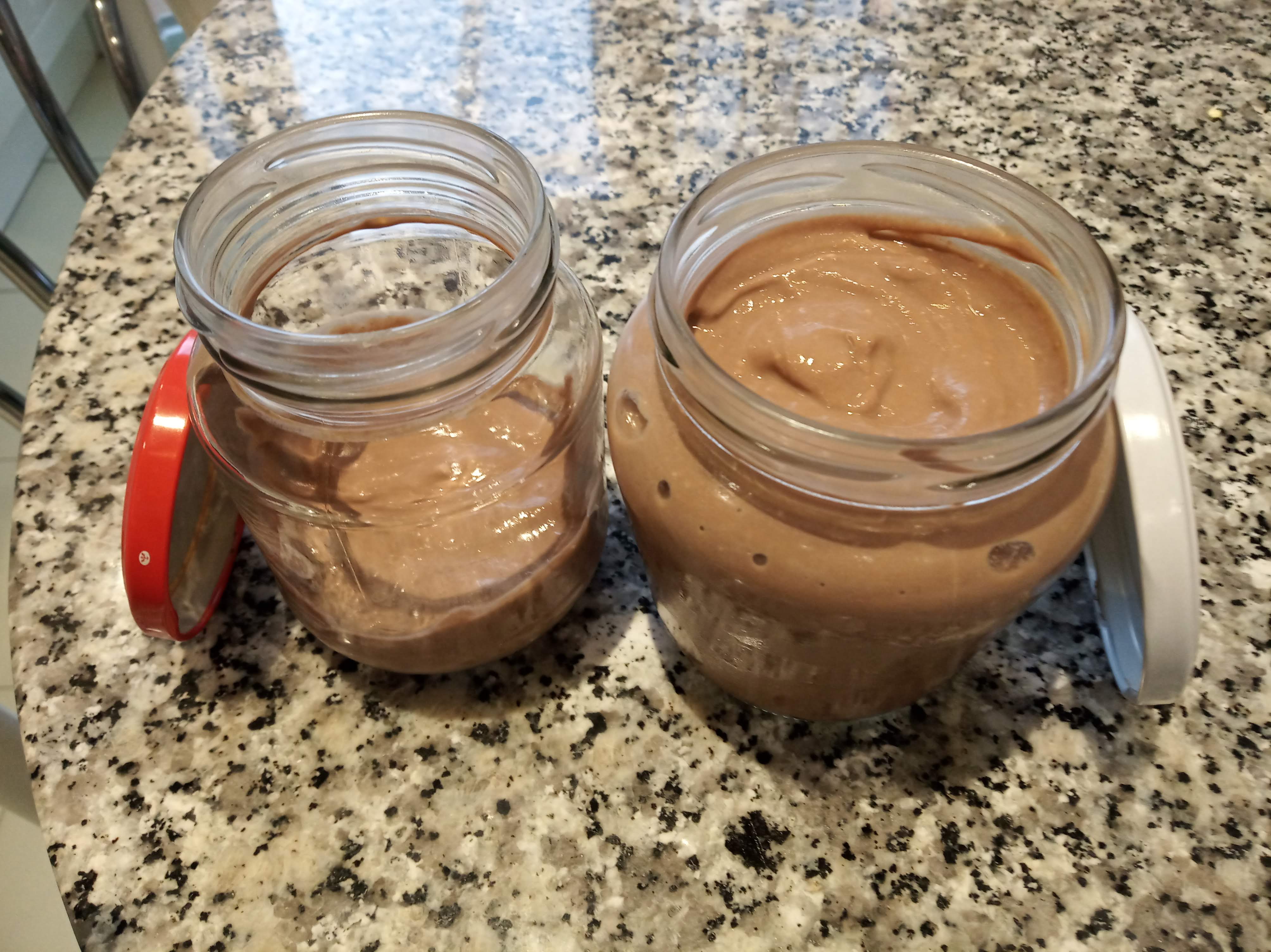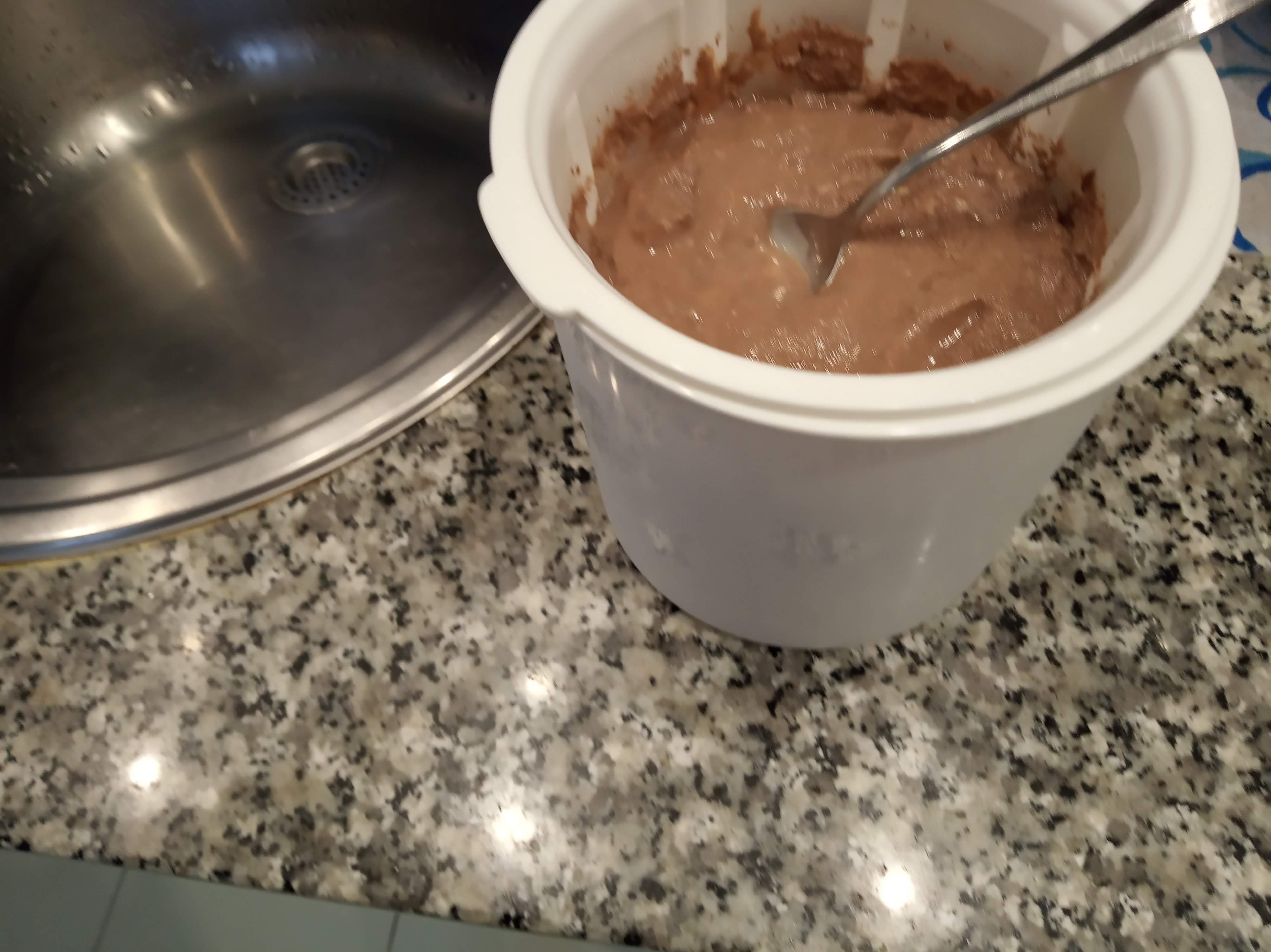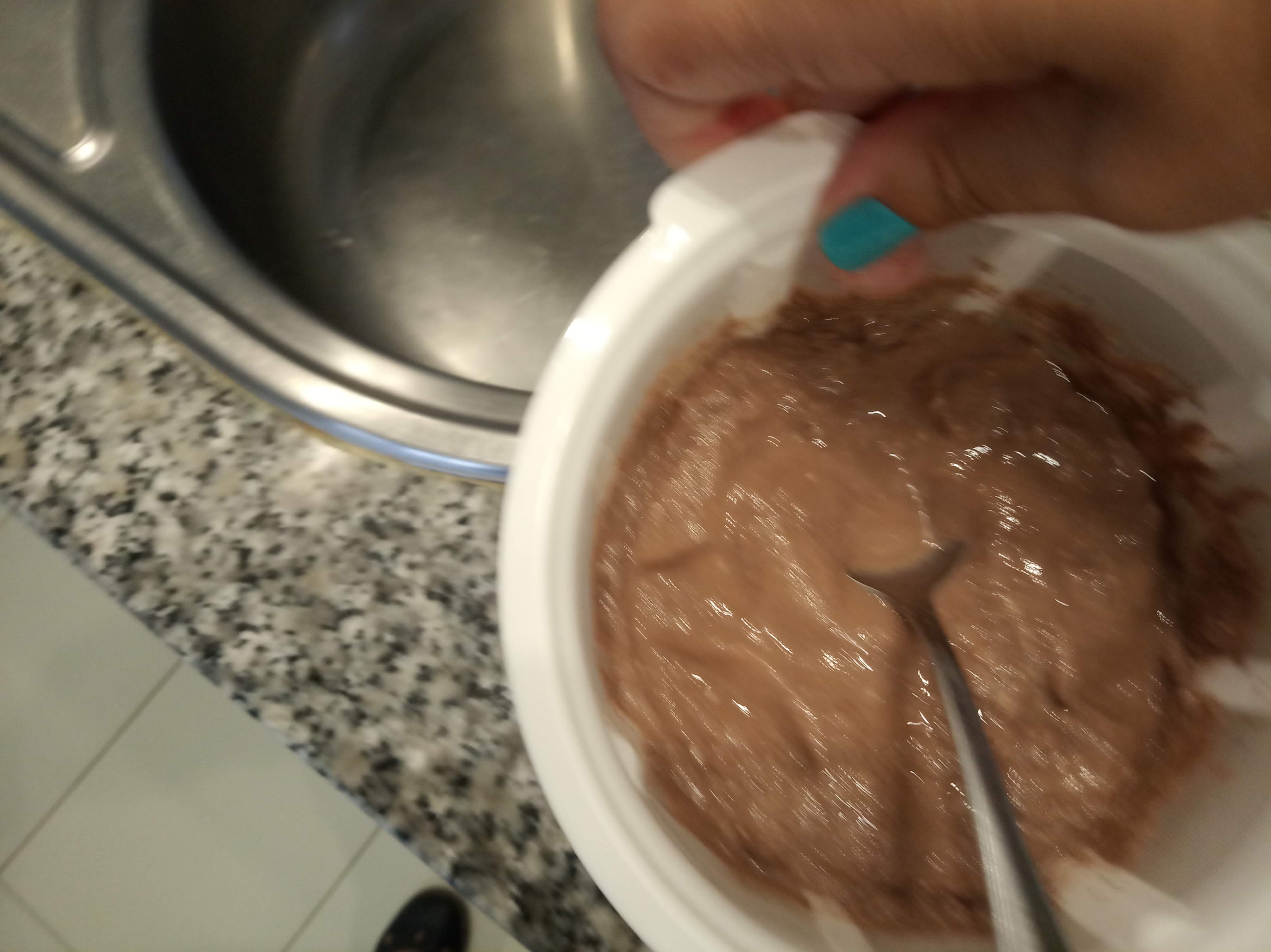 Este lo hice con bebida de soja sabor chocolate y sobres granulados de stevia y un bote.