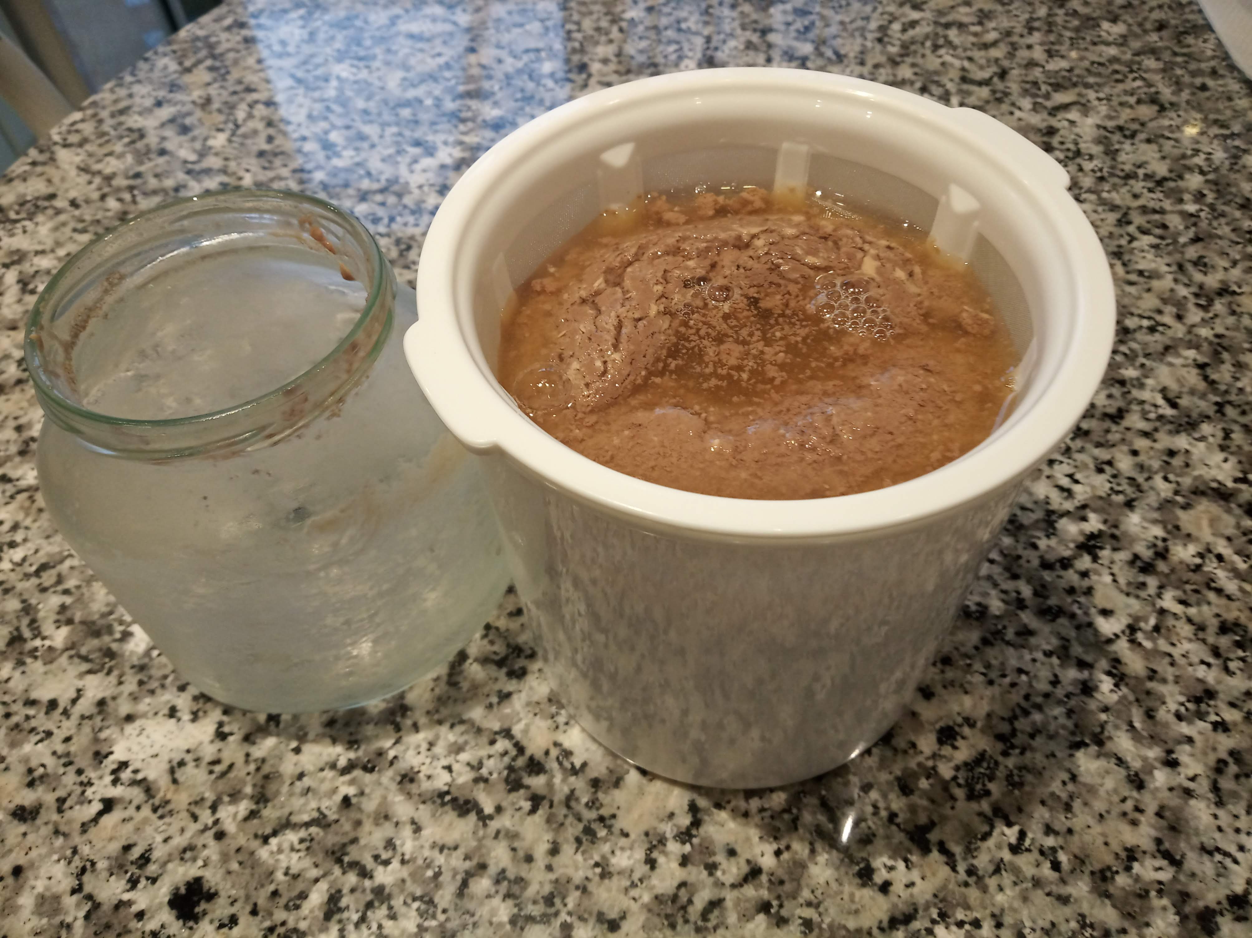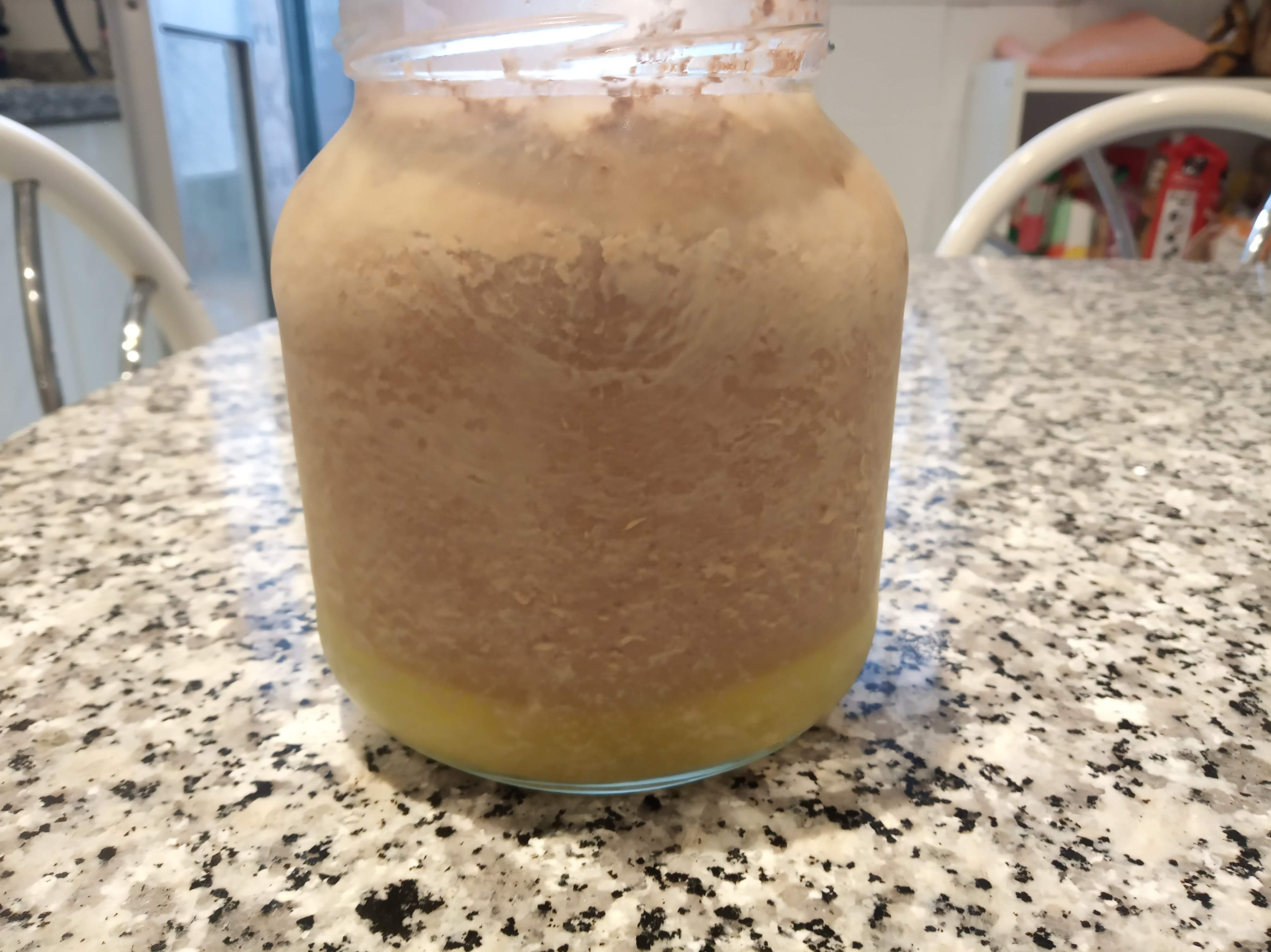 Pasado ese tiempo, sacar el bote de la yogurtera, y dejar enfriar una hora, se vera, que se separa el liquido en el fondo.