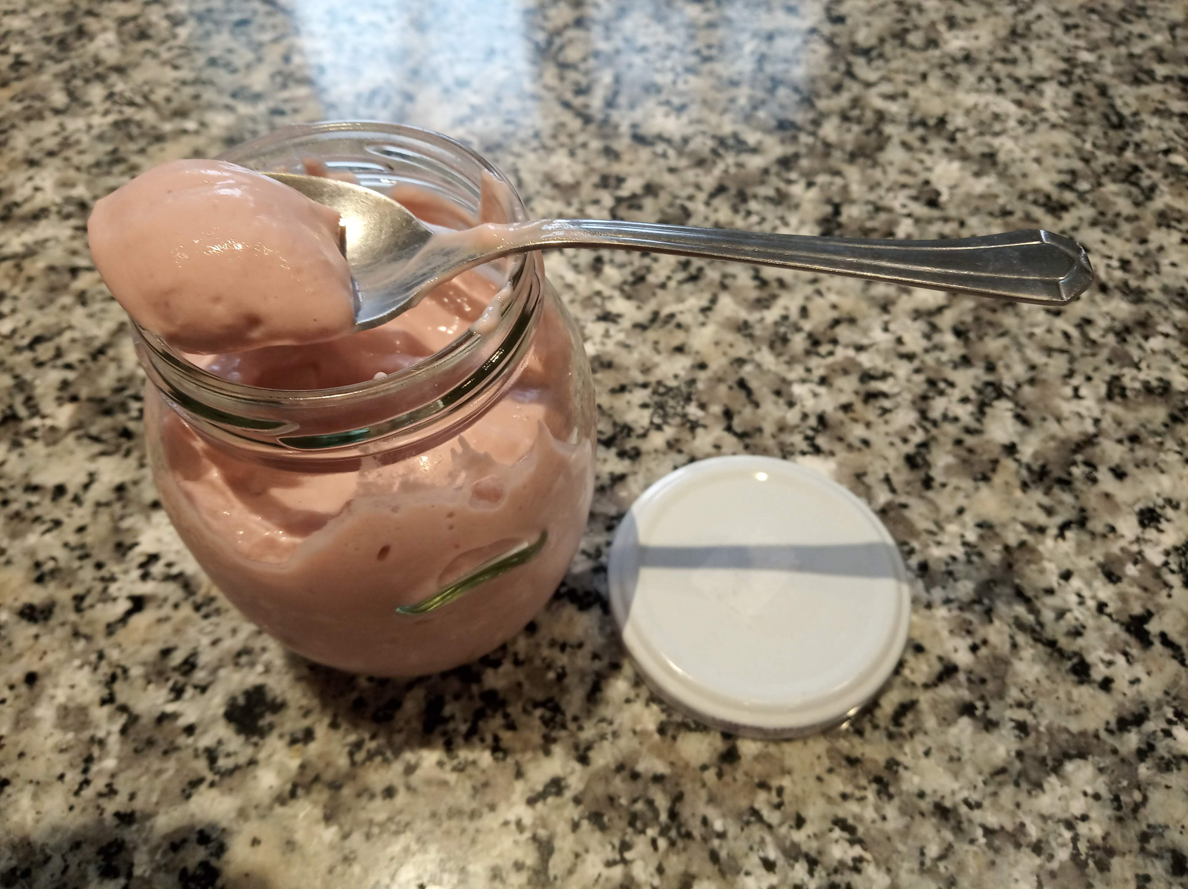 En el bote de cristal, echamos un poco de leche, el yogur, el azúcar o stevia y el sirope de fresa.