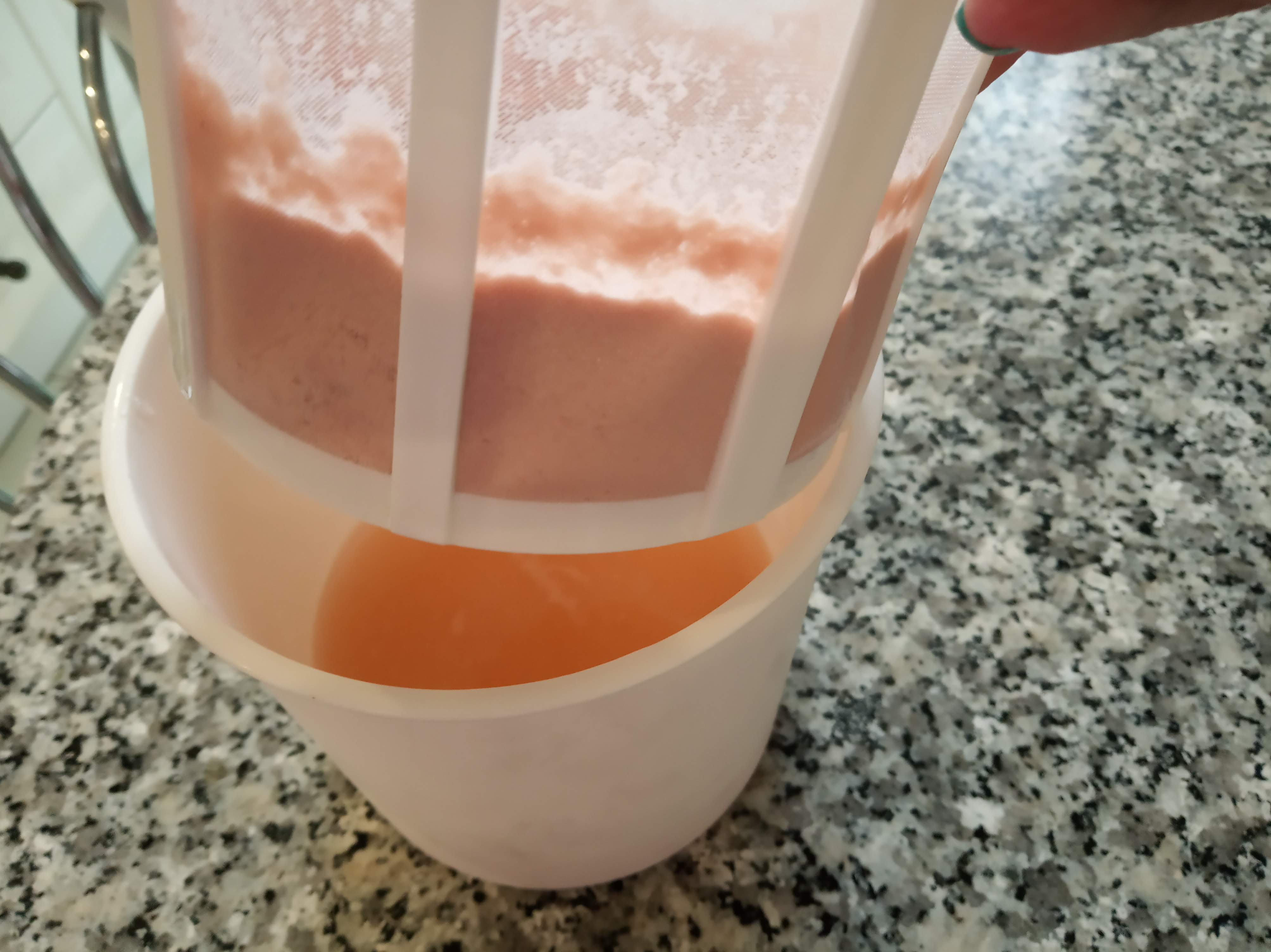 Pasado ese tiempo, meter el bote en el frigorífico 12 h. a la ½ de tiempo, pasar al vaso de escurrir de la yogurtera, hasta que pasen las 12 h.